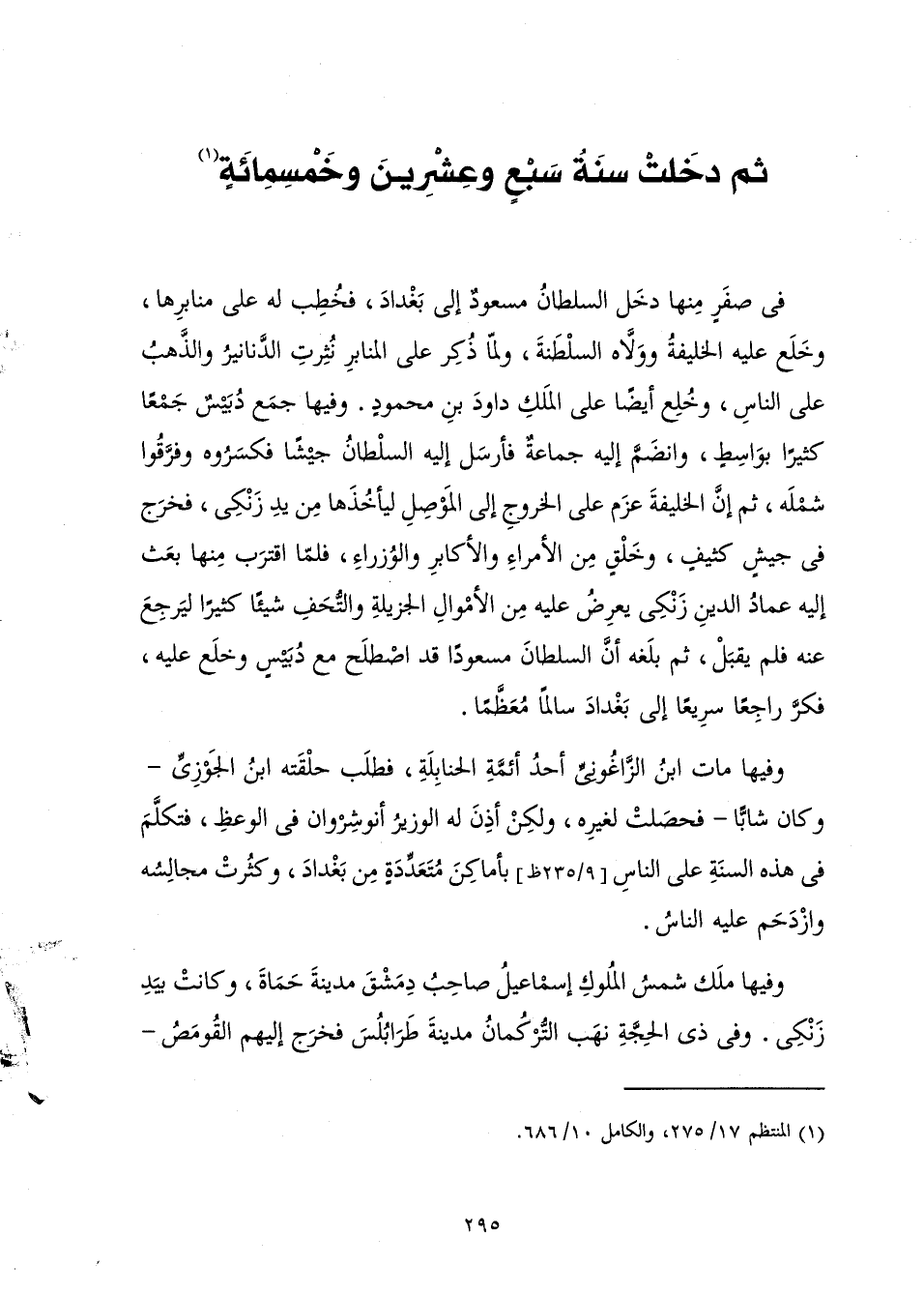 فِي صَفَرٍ مِنْهَا دَخَلَ السُّلْطَانُ مَسْعُودٌ إِلَى بَغْدَادَ، فَخُطِبَ لَهُ عَلَى مَنَابِرِهَا، وَخَلَعَ عَلَيْهِ الْخَلِيفَةُ وَوَلَّاهُ السَّلْطَنَةَ، وَلَمَّا ذُكِرَ عَلَى الْمَنَابِرِ نُثِرَتِ الدَّنَانِيرُ وَالذَّهَبُ عَلَى النَّاسِ، وَخُلِعَ عَلَى الْمَلِكِ دَاوُدَ بْنِ مَحْمُودٍ. وَفِيهَا جَمَعَ دُبَيْسٌ جَمْعًا كَثِيرًا بِوَاسِطٍ وَانْضَمَّ إِلَيْهِ جَمَاعَةٌ، فَأَرْسَلَ إِلَيْهِ السُّلْطَانُ جَيْشًا فَكَسَرُوهُ وَفَرَّقُوا شَمْلَهُ، ثُمَّ إِنَّ الْخَلِيفَةَ عَزَمَ عَلَى الْخُرُوجِ إِلَى الْمَوْصِلِ، لِيَأْخُذَهَا مِنْ يَدِ زَنْكِي، فَخَرَجَ فِي جَيْشٍ كَثِيفٍ وَخَلْقٍ مِنَ الْأُمَرَاءِ وَالْأَكَابِرِ وَالْوُزَرَاءِ، فَلَمَّا اقْتَرَبَ مِنْهَا بَعَثَ إِلَيْهِ عِمَادُ الدِّينِ زَنْكِي يَعْرِضُ عَلَيْهِ مِنَ الْأَمْوَالِ الْجَزِيلَةِ وَالتُّحَفِ شَيْئًا كَثِيرًا؛ لِيَرْجِعَ عَنْهُ فَلَمْ يَقْبَلْ، ثُمَّ بَلَغَهُ أَنَّ السُّلْطَانَ مَسْعُودًا قَدِ اصْطَلَحَ مَعَ دُبَيْسٍ، وَخَلَعَ عَلَيْهِ فَكَرَّ رَاجِعًا سَرِيعًا إِلَى بَغْدَادَ سَالِمًا مُعَظَّمًا.