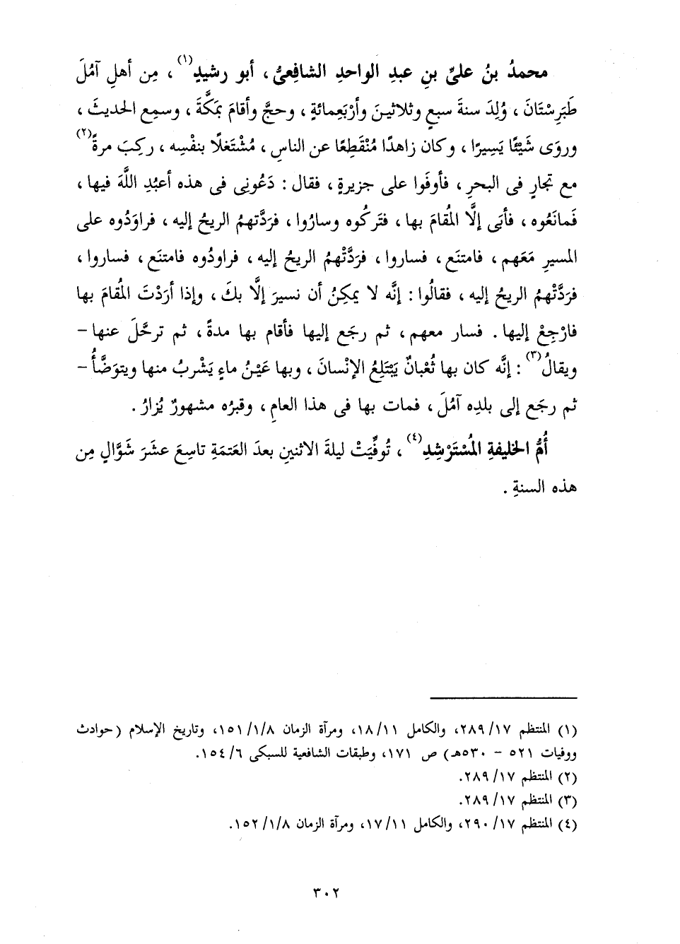 أَبُو رَشِيدٍ مِنْ أَهْلِ آمُلَ طَبَرِسْتَانَ، وُلِدَ سَنَةَ أَرْبَعٍ وَثَلَاثِينَ وَأَرْبَعِمِائَةٍ وَحَجَّ وَأَقَامَ بِمَكَّةَ، وَسَمِعَ مِنَ الْحَدِيثِ وَرَوَى شَيْئًا يَسِيرًا، وَكَانَ زَاهِدًا مُنْقَطِعًا عَنِ النَّاسِ مُشْتَغِلًا بِنَفْسِهِ، رَكِبَ مَرَّةً مَعَ تُجَّارٍ فِي الْبَحْرِ فَأَوْفَوْا عَلَى جَزِيرَةٍ، فَقَالَ: دَعُونِي فِي هَذِهِ أَعْبُدِ اللَّهَ فِيهَا، فَمَانَعُوهُ، فَأَبَى إِلَّا الْمُقَامَ بِهَا، فَتَرَكُوهُ وَسَارُوا، فَرَدَّتْهُمُ الرِّيحُ، فَرَاوَدُوهُ عَلَى الْمَسِيرِ مَعَهُمْ فَامْتَنَعَ فَسَارُوا فَرَدَّتْهُمُ الرِّيحُ إِلَيْهِ، فَرَاوَدُوهُ فَامْتَنَعَ فَسَارُوا فَرَدَّتْهُمُ الرِّيحُ إِلَيْهِ، فَقَالُوا: إِنَّهُ لَا يُمْكِنُ أَنْ نَسِيرَ إِلَّا بِكَ، وَإِذَا أَرَدْتَ الْمُقَامَ بِهَا فَارْجِعْ إِلَيْهَا فَسَارَ مَعَهُمْ، ثُمَّ رَجَعَ إِلَيْهَا فَأَقَامَ بِهَا مُدَّةً، ثُمَّ تَرَحَّلَ عَنْهَا، وَيُقَالُ: إِنَّهُ كَانَ بِهَا ثُعْبَانٌ يَبْتَلِعُ الْإِنْسَانَ، وَبِهَا عَيْنُ مَاءٍ يَشْرَبُ مِنْهَا وَيَتَوَضَّأُ، ثُمَّ رَجَعَ إِلَى بَلَدِهِ آمُلَ، فَمَاتَ بِهَا فِي هَذَا الْعَامِ، وَقَبَرُهُ مَشْهُورٌ يُزَارُ.