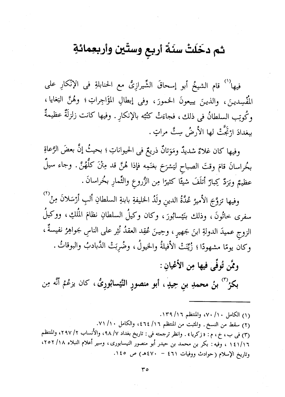فِيهَا قَامَ الشَّيْخُ أَبُو إِسْحَاقَ الشِّيرَازِيُّ مَعَ الْحَنَابِلَةِ فِي الْإِنْكَارِ عَلَى الْمُفْسِدِينَ، وَالَّذِينَ يَبِيعُونَ الْخُمُورَ، وَفِي إِبْطَالِ الْمُؤَاجِرَاتِ وَهُنَّ الْبَغَايَا وَكُوتِبَ السُّلْطَانُ فِي ذَلِكَ فَجَاءَتْ كُتُبُهُ بِالْإِنْكَارِ، وَفِيهَا كَانَتْ زَلْزَلَةٌ عَظِيمَةٌ بِبَغْدَادَ ارْتَجَّتْ لَهَا الْأَرْضُ سِتَّ مَرَّاتٍ.