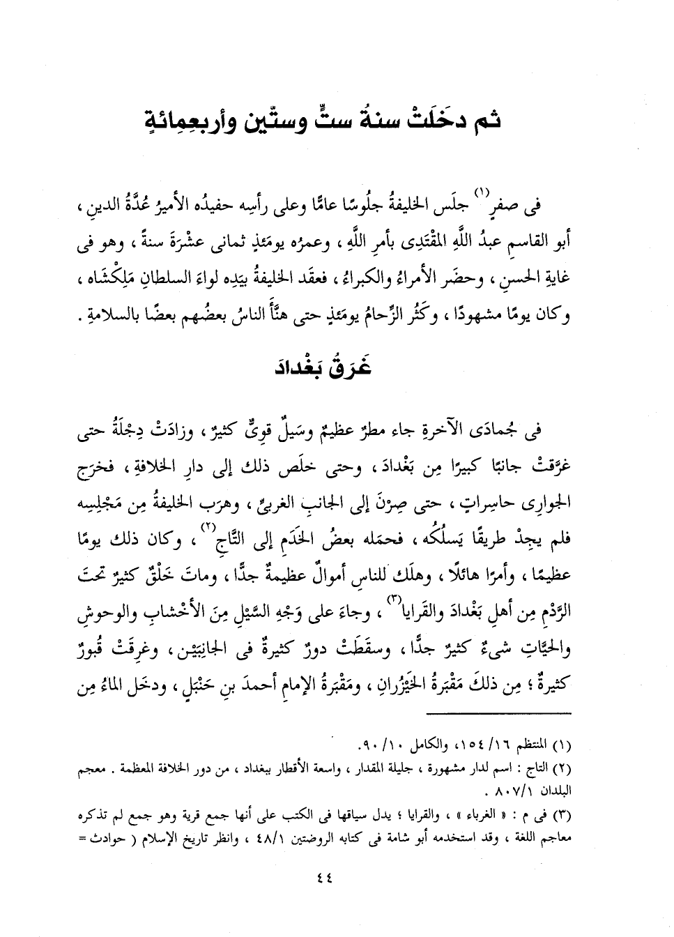 فِي جُمَادَى الْآخِرَةِ جَاءَ مَطَرٌ عَظِيمٌ وَسَيْلٌ قَوِيٌّ كَثِيرٌ، وَزَادَتْ دِجْلَةُ حَتَّى غَرَّقَتْ جَانِبًا كَبِيرًا مِنْ بَغْدَادَ حَتَّى خَلَصَ ذَلِكَ إِلَى دَارِ الْخِلَافَةِ، فَخَرَجَ الْجَوَارِي حَاسِرَاتٍ حَتَّى صِرْنَ إِلَى الْجَانِبِ الْغَرْبِيِّ وَهَرَبَ الْخَلِيفَةُ مِنْ مَجْلِسِهِ، فَلَمْ يَجِدْ طَرِيقًا يَسْلُكُهُ، فَحَمَلَهُ بَعْضُ الْخَدَمِ إِلَى التَّاجِ، وَكَانَ ذَلِكَ يَوْمًا عَظِيمًا وَأَمْرًا هَائِلًا وَهَلَكَ لِلنَّاسِ أَمْوَالٌ عَظِيمَةٌ جِدًّا، وَمَاتَ خَلْقٌ كَثِيرٌ تَحْتَ الرَّدْمِ مِنْ أَهْلِ بَغْدَادَ وَالْقَرَايَا، وَجَاءَ عَلَى وَجْهِ السَّيْلِ مِنَ الْأَخْشَابِ وَالْوُحُوشِ وَالْحَيَّاتِ شَيْءٌ كَثِيرٌ جِدًّا، وَسَقَطَتْ دُورٌ كَثِيرَةٌ فِي الْجَانِبَيْنِ وَغَرِقَتْ قُبُورٌ كَثِيرَةٌ ; مِنْ ذَلِكَ قَبْرُ الْخَيْزُرَانِ، وَمَقْبَرَةُ الْإِمَامِ أَحْمَدَ بْنِ حَنْبَلٍ، وَدَخَلَ الْمَاءُ مِنْ