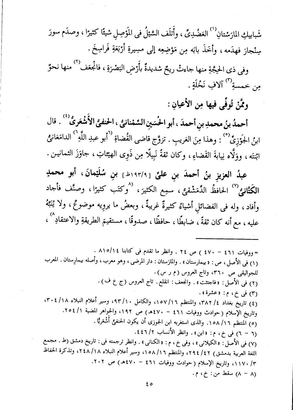 وَمِمَّنْ تُوُفِّيَ فِيهَا مِنَ الْأَعْيَانِ: أَحْمَدُ بْنُ مُحَمَّدِ بْنِ الْحَسَنِ السِّمْنَانِيُّ الْحَنَفِيُّ الْأَشْعَرِيُّ قَالَ ابْنُ الْجَوْزِيِّ: وَهَذَا مِنَ الْغَرِيبِ. تَزَوَّجَ قَاضِي الْقُضَاةِ أَبُو عَبْدِ اللَّهِ الدَّامَغَانِيُّ ابْنَتَهُ وَوَلَّاهُ نِيَابَةَ الْقَضَاءِ، وَكَانَ ثِقَةً نَبِيلًا مِنْ ذَوِي الْهَيْئَاتِ جَاوَزَ الثَّمَانِينَ.