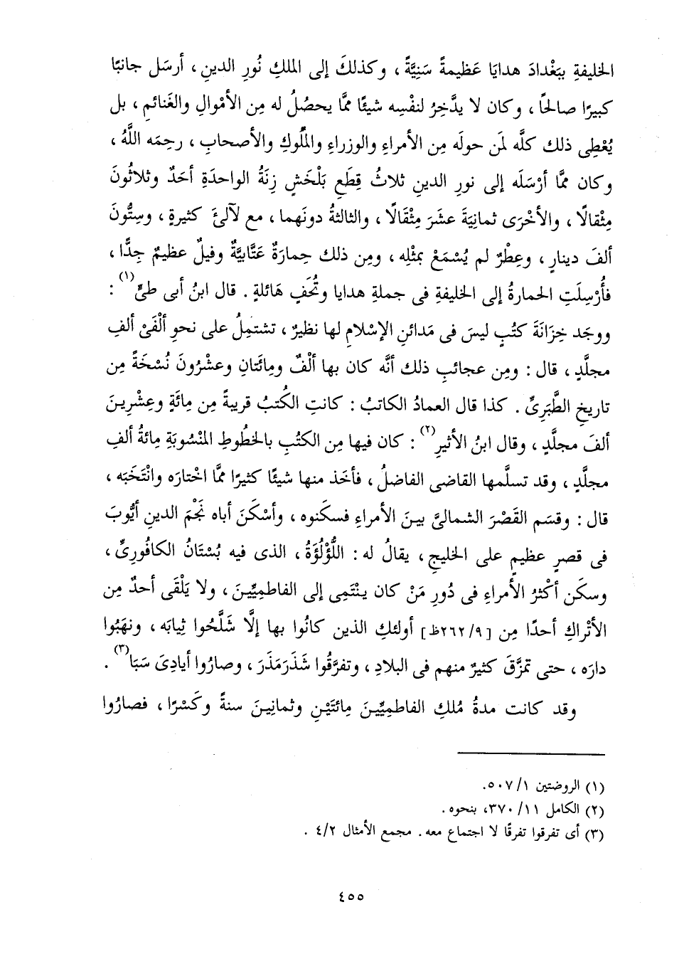 إِلَى الْخَلِيفَةِ بِبَغْدَادَ مِنْ ذَلِكَ هَدَايَا عَظِيمَةً سَنِيَّةً وَكَذَلِكَ إِلَى الْمَلِكِ نُورِ الدِّينِ أَرْسَلَ إِلَيْهِ جَانِبًا كَبِيرًا صَالِحًا، وَكَانَ لَا يَدَّخِرُ لِنَفْسِهِ شَيْئًا مِمَّا يَحْصُلُ لَهُ مِنَ الْأَمْوَالِ ; بَلْ كَانَ يُعْطِي ذَلِكَ كُلَّهُ لِمَنْ حَوْلَهُ مِنَ الْأُمَرَاءِ وَالْوُزَرَاءِ وَالْمُلُوكِ وَالْأَصْحَابِ، رَحِمَهُ اللَّهُ وَكَانَ مِمَّا أَرْسَلَهُ إِلَى نُورِ الدِّينِ ثَلَاثُ قِطَعٍ بَلْخَشٍ ; زِنَةُ الْوَاحِدَةِ أَحَدٌ وَثَلَاثُونَ مِثْقَالًا وَالْأُخْرَى ثَمَانِيَةَ عَشَرَ مِثْقَالًا وَالثَّالِثَةُ دُونَهُمَا، مَعَ لَآلِئَ كَثِيرَةٍ وَسِتُّونَ أَلْفَ دِينَارٍ، وَعِطْرٌ لَمْ يُسْمَعْ بِمِثْلِهِ، وَمِنْ ذَلِكَ حِمَارَةٌ عَتَّابِيَّةٌ وَفِيلٌ عَظِيمٌ جِدًّا، فَأُرْسِلَتِ الْحِمَارَةُ إِلَى الْخَلِيفَةِ فِي جُمْلَةِ هَدَايَا وَتُحَفٍ هَائِلَةٍ، قَالَ ابْنُ أَبِي طَيٍّ: وَوَجَدَ خِزَانَةَ كُتُبٍ لَيْسَ فِي مَدَائِنِ الْإِسْلَامِ لَهَا نَظِيرٌ ; تَشْتَمِلُ عَلَى أَلْفَيْ أَلْفِ مُجَلَّدٍ قَالَ: وَمِنْ عَجَائِبِ ذَلِكَ أَنَّهُ كَانَ بِهَا أَلْفٌ وَمِائَتَانِ وَعِشْرُونَ نُسْخَةً مِنْ تَارِيخِ الطَّبَرِيِّ، كَذَا قَالَ الْعِمَادُ الْكَاتِبُ كَانْتِ الْكُتُبُ قَرِيبَةً مِنْ مِائَةٍ وَعِشْرِينَ أَلْفَ مُجَلَّدٍ، وَقَالَ ابْنُ الْأَثِيرِ كَانَ فِيهَا مِنَ الْكُتُبِ بِالْخُطُوطِ الْمَنْسُوبَةِ مِائَةُ أَلْفِ مُجَلَّدٍ، وَقَدْ تَسَلَّمَهَا الْقَاضِي الْفَاضِلُ فَأَخَذَ مِنْهَا شَيْئًا كَثِيرًا مِمَّا اخْتَارَهُ وَانْتَخَبَهُ، قَالَ وَقَسَمَ الْقَصْرَ الشَّمَالِيَّ بَيْنَ الْأُمَرَاءِ فَسَكَنُوهُ وَأَسْكَنَ أَبَاهُ نَجْمَ الدِّينِ أَيُّوبَ فِي قَصْرٍ عَظِيمٍ عَلَى الْخَلِيجِ، يُقَالُ لَهُ: اللُّؤْلُؤَةُ الَّذِي فِيهِ بُسْتَانُ الْكِافُورِيِّ