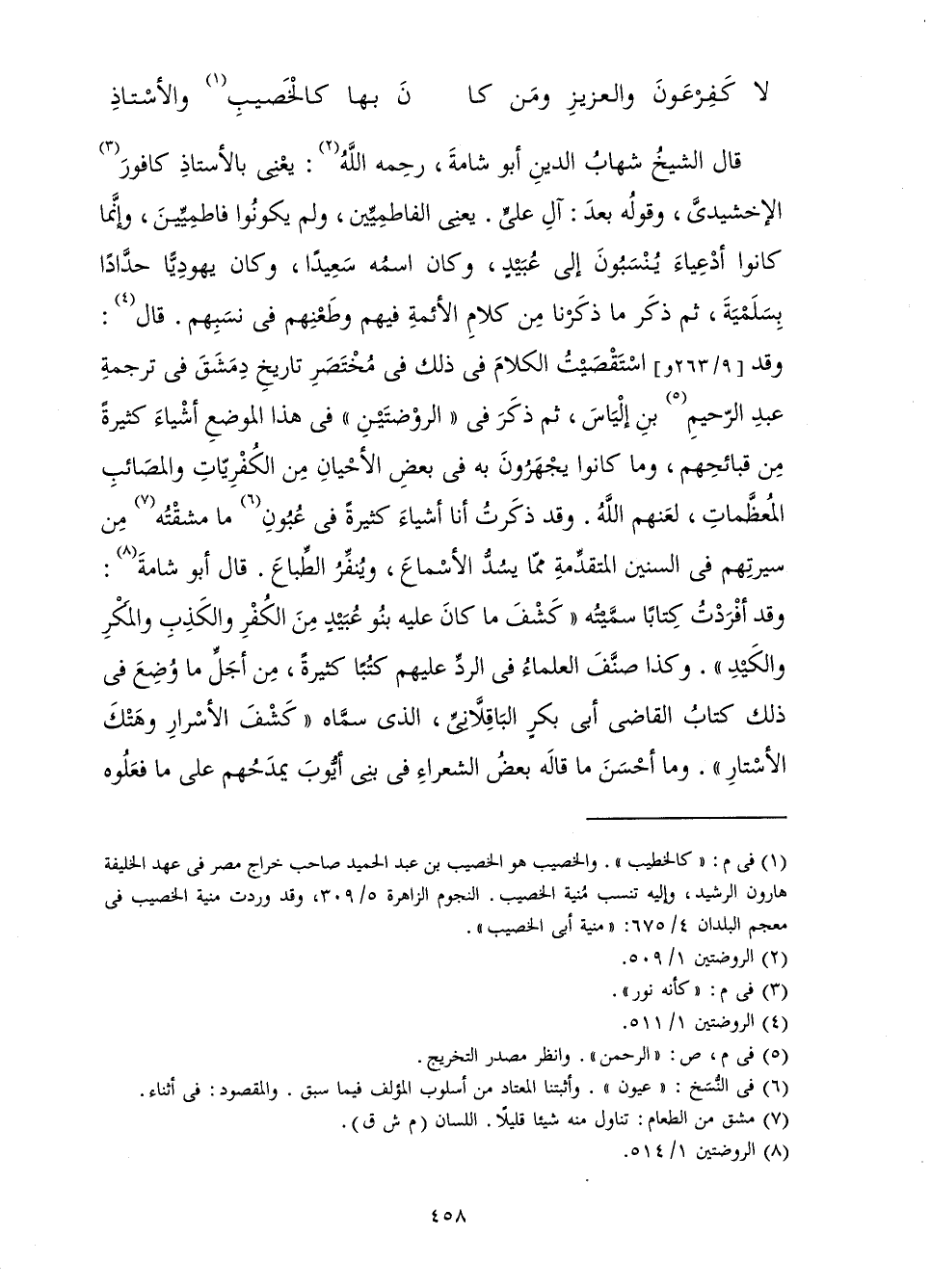 قَالَ الشَّيْخُ شِهَابُ الدِّينِ أَبُو شَامَةَ رَحِمَهُ اللَّهُ يَعْنِي بِالْأُسْتَاذِ: كَافُورَ الْإِخْشِيدِيَّ، وَقَوْلُهُ: آلُ عَلِيٍّ يَعْنِي الْفَاطِمِيِّينَ وَلَمْ يَكُونُوا فَاطِمِيِّينَ ; وَإِنَّمَا كَانُوا أَدْعِيَاءَ يُنْسَبُونَ إِلَى عُبَيْدٍ، وَكَانَ اسْمُهُ سَعِيدًا، وَكَانَ يَهُودِيًّا حَدَّادًا بِسَلَمْيَةَ، ثُمَّ ذَكَرَ مَا ذَكَرْنَاهُ مِنْ كَلَامِ الْأَئِمَّةِ فِيهِمْ وَطَعْنِهِمْ فِي نَسَبِهِمْ، قَالَ: وَقَدِ اسْتَقْصَيْتُ الْكَلَامَ فِي ذَلِكَ فِي مُخْتَصَرِ تَارِيخِ دِمَشْقَ فِي تَرْجَمَةِ عَبْدِ الرَّحِيمِ بْنِ إِلْيَاسَ، ثُمَّ ذَكَرَ فِي الرَّوْضَتَيْنِ فِي هَذَا الْمَوْضِعِ أَشْيَاءَ كَثِيرَةً مِنْ قَبَائِحِهِمْ، وَمَا كَانُوا يَجْهَرُونَ بِهِ فِي بَعْضِ الْأَحْيَانِ مِنَ الْكُفْرِيَّاتِ وَالْمَصَائِبِ الْمُعَظَّمَاتِ، لَعَنَهُمُ اللَّهُ، وَقَدْ ذَكَرْتُ أَنَا أَشْيَاءَ كَثِيرَةً فِي غُبُونِ مَا مَشَقْتُهُ مِنْ سِيرَتِهِمْ فِي السِّنِينِ الْمُتَقَدِّمَةِ مِمَّا يَسُدُّ الْأَسْمَاعَ وَيُنَفِّرُ الطِّبَاعَ، قَالَ أَبُو شَامَةَ: وَقَدْ أَفْرَدْتُ كِتَابًا سَمَّيْتُهُ كَشْفَ مَا كَانَ عَلَيْهِ بَنُو عُبَيْدٍ مِنَ الْكُفْرِ وَالْكَذِبِ وَالْمَكْرِ وَالْكَيْدِ، وَكَذَا صَنَّفَ الْعُلَمَاءُ فِي الرَّدِّ عَلَيْهِمْ كُتُبًا كَثِيرَةً، مِنْ أَجَلِ مَا وُضِعَ فِي ذَلِكَ: كِتَابُ الْقَاضِي أَبِي بَكْرٍ الْبَاقِلَّانِيِّ الَّذِي سَمَّاهُ كَشْفَ الْأَسْرَارِ وَهَتْكَ الْأَسْتَارِ
