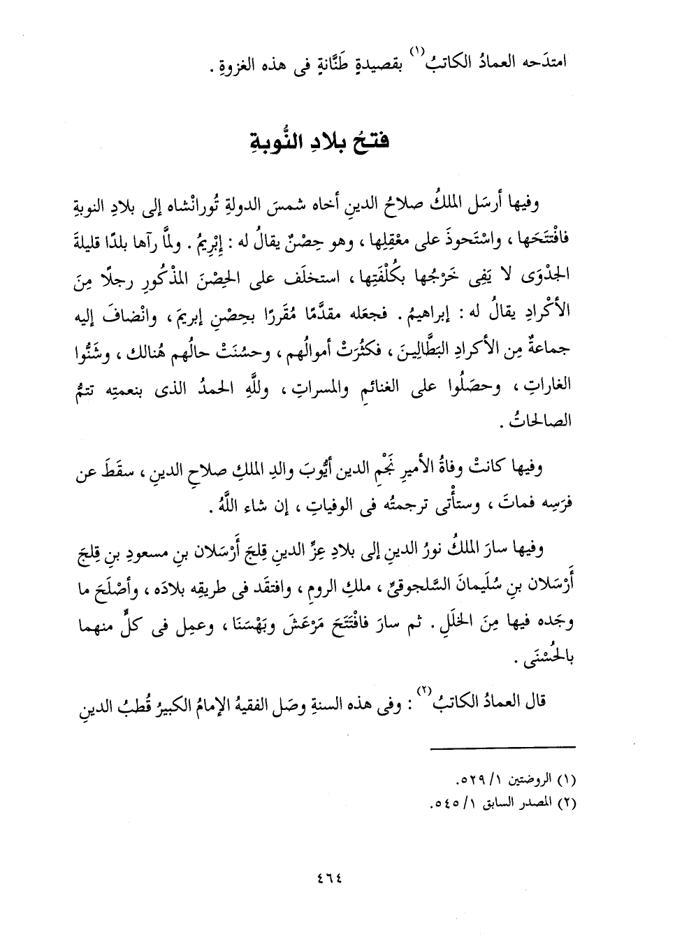 وَفِيهَا أَرْسَلَ السُّلْطَانُ صَلَاحُ الدِّينِ أَخَاهُ شَمْسَ الدَّوْلَةِ تُورَانْشَاهْ إِلَى بِلَادِ النُّوبَةِ فَافْتَتَحَهَا، وَاسْتَحْوَذَ عَلَى مَعْقِلِهَا، وَهُوَ حِصْنٌ يُقَالُ لَهُ: إِبْرِيمُ. وَلَمَّا رَآهَا بَلَدًا قَلِيلَةَ الْجَدْوَى لَا يَفِي خَرَاجُهَا بِكُلْفَتِهَا، اسْتَخْلَفَ عَلَى الْحِصْنِ الْمَذْكُورِ رَجُلًا مِنَ الْأَكْرَادِ يُقَالُ لَهُ: إِبْرَاهِيمُ. فَجَعَلَهُ مُقَدَّمًا مُقَرَّرًا بِحِصْنِ إِبْرِيمَ، وَانْضَافَ إِلَيْهِ جَمَاعَةٌ مِنَ الْأَكْرَادِ الْبَطَّالِينَ، فَكَثُرَتْ أَمْوَالُهُمْ وَحَسُنَتْ حَالُهُمْ هُنَالِكَ وَشَنُّوا الْغَارَاتِ وَحَصَلُوا عَلَى الْغَنَائِمِ وَالْمَسَرَّاتِ، وَلِلَّهِ الْحَمْدُ الَّذِي بِنِعْمَتِهِ تَتِمُّ الصَّالِحَاتُ.