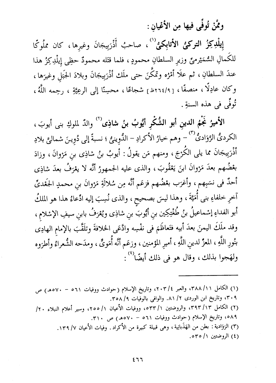 وَالِدٌ لِمُلُوكِ بَنِي أَيُّوبَ، الْكُرْدِيُّ الرَّوَادِيُّ - وَهُمْ خِيَارُ الْأَكْرَادِ - الدُّوِينِيُّ ; نِسْبَةً إِلَى دُوِينَ شَمَالِيَّ بِلَادِ أَذْرَبِيجَانَ مِمَّا يَلِي الْكَرَجَ، وَمِنْهُمْ مَنْ يَقُولُ: أَيُّوبُ بْنُ شَاذِيِّ بْنِ مَرْوَانَ، وَزَادَ بَعْضُهُمْ بَعْدَ مَرْوَانَ بْنَ يَعْقُوبَ، وَالَّذِي عَلَيْهِ الْجُمْهُورُ أَنَّهُ لَا يُعْرَفُ بَعْدَ شَاذِيٍّ أَحَدٌ فِي نَسَبِهِمْ، وَأَغْرَبَ بَعْضُهُمْ فَزَعَمَ أَنَّهُ مِنْ سُلَالَةِ مَرْوَانَ بْنِ مُحَمَّدٍ الْجَعْدِيِّ آخِرِ خُلَفَاءِ بَنِي أُمَيَّةَ، وَهَذَا لَيْسَ بِصَحِيحٍ وَالَّذِي نُسِبَ إِلَيْهِ ادِّعَاءُ هَذَا هُوَ الْمَلِكُ أَبُو الْفِدَاءِ إِسْمَاعِيلُ بْنُ طُغْتِكِينَ بْنِ أَيُّوبَ بْنِ شَاذِيٍّ وَيُعْرَفُ بِابْنِ سَيْفِ الْإِسْلَامِ، وَقَدْ مَلَكَ الْيَمَنَ بَعْدَ أَبِيهِ، فَتَعَاظَمَ فِي نَفْسِهِ وَادَّعَى الْخِلَافَةَ، وَتَلَقَّبَ بِالْإِمَامِ الْهَادِي بِنُورِ اللَّهِ، الْمُعِزِّ لِدِينِ اللَّهِ، أَمِيرِ الْمُؤْمِنِينَ، وَزَعَمَ أَنَّهُ أُمَوِيٌّ وَمَدَحَهُ الشُّعَرَاءُ وَأَطْرَوْهُ وَلَهَجُوا بِذَلِكَ، وَقَالَ هُوَ فِي ذَلِكَ أَيْضًا: