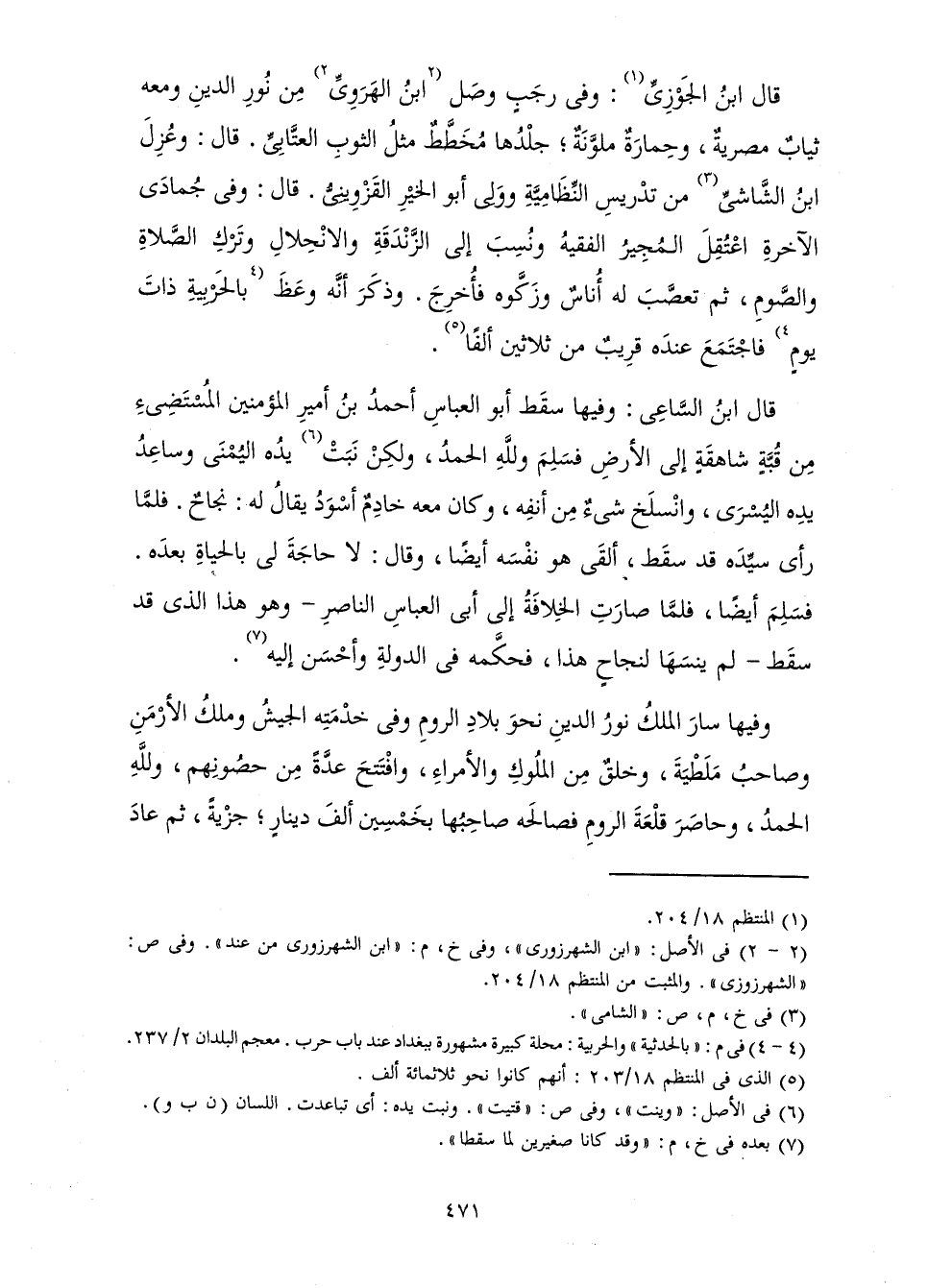 قَالَ ابْنُ الْجَوْزِيِّ: وَفِي رَجَبٍ وَصَلَ ابْنُ الْهَرَوِيِّ مِنْ نُورِ الدِّينِ وَمَعَهُ ثِيَابٌ مِصْرِيَّةٌ، وَحِمَارَةٌ مُلَوَّنَةٌ ; جِلْدُهَا مُخَطَّطٌ مِثْلُ الثَّوْبِ الْعِتَّابِيِّ. قَالَ: وَعُزِلَ ابْنُ الشَّاشِيِّ مِنْ تَدْرِيسِ النِّظَامِيَّةِ وَوَلِيَ أَبُو الْخَيْرِ الْقَزْوِينِيُّ. قَالَ: وَفِي جُمَادَى الْآخِرَةِ اعْتُقِلَ الْمُجِيرُ الْفَقِيهُ وَنُسِبَ إِلَى الزَّنْدَقَةِ وَالِانْحِلَالِ وَتَرْكِ الصَّلَاةِ وَالصَّوْمِ، ثُمَّ تَعَصَّبَ لَهُ أُنَاسٌ وَزَكَّوْهُ فَأُخْرِجَ. وَذُكِرَ أَنَّهُ وَعَظَ بِالْحَرْبِيَّةِ ذَاتَ يَوْمٍ فَاجْتَمَعَ عِنْدَهُ قَرِيبٌ مِنْ ثَلَاثِينَ أَلْفًا.