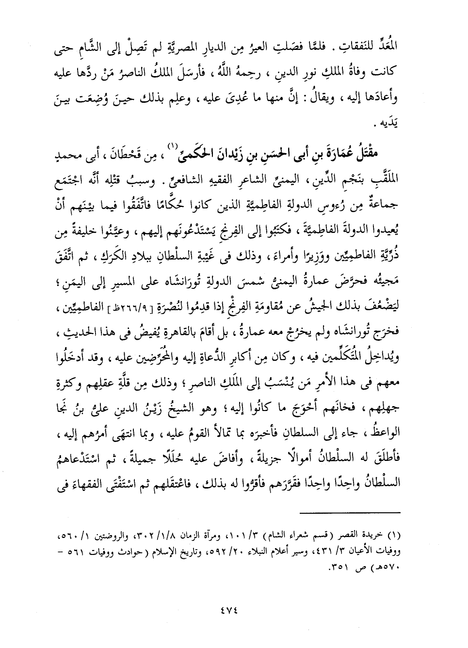 مِنْ قَحْطَانَ أَبُو مُحَمَّدٍ الْمُلَقَّبُ بِنَجْمِ الدِّينِ الْيَمَنِيِّ الشَّاعِرُ الْفَقِيهُ الشَّافِعِيُّ. وَسَبَبُ قَتْلِهِ أَنَّهُ اجْتَمَعَ جَمَاعَةٌ مِنْ رُءُوسِ الدَّوْلَةِ الْفَاطِمِيَّةِ، فَكَتَبُوا إِلَى الْفِرِنْجِ يَسْتَدْعُونَهُمْ إِلَيْهِمْ، وَعَيَّنُوا خَلِيفَةً مِنْ ذُرِّيَّةِ الْفَاطِمِيِّينَ وَوَزِيرًا وَأُمَرَاءَ، وَذَلِكَ فِي غَيْبَةِ السُّلْطَانِ بِبِلَادِ الْكَرَكِ ثُمَّ اتَّفَقَ مَجِيئُهُ فَحَرَّضَ عُمَارَةُ الْيَمَنِيُّ شَمْسَ الدَّوْلَةِ تُورَانْشَاهْ عَلَى الْمَسِيرِ إِلَى الْيَمَنِ ; لِيَضْعُفَ بِذَلِكَ الْجَيْشُ عَنْ مُقَاوَمَةِ الْفِرِنْجِ إِذَا قَدِمُوا لِنُصْرَةِ الْفَاطِمِيِّينَ، فَخَرَجَ تُورَانْشَاهْ وَلَمْ يَخْرُجْ مَعَهُ عُمَارَةُ، بَلْ أَقَامَ بِالْقَاهِرَةِ يُفِيضُ فِي هَذَا الْحَدِيثِ، وَيُدَاخِلُ الْمُتَكَلِّمِينَ فِيهِ، وَكَانَ مِنْ أَكَابِرِ الدُّعَاةِ إِلَيْهِ وَالْمُحَرِّضِينَ عَلَيْهِ وَقَدْ أَدْخَلُوا مَعَهُمْ فِي هَذَا الْأَمْرِ مَنْ يُنْسَبُ إِلَى الْمَلِكِ النَّاصِرِ ; وَذَلِكَ مِنْ قِلَّةِ عُقُولِهِمْ وَكَثْرَةِ جَهْلِهِمْ فَخَانَهُمْ، أَحْوَجَ مَا كَانُوا إِلَيْهِ ; وَهُوَ الشَّيْخُ زَيْنُ الدِّينِ عَلِيُّ بْنُ نَجَا الْوَاعِظُ، جَاءَ إِلَى السُّلْطَانِ فَأَخْبَرَهُ بِمَا تَمَالَأَ الْقَوْمُ عَلَيْهِ، وَبِمَا انْتَهَى أَمْرُهُمْ إِلَيْهِ، فَأَطْلَقَ لَهُ السُّلْطَانُ أَمْوَالًا جَزِيلَةً، وَأَفَاضَ عَلَيْهِ حُلَلًا جَمِيلَةً، ثُمَّ اسْتَدْعَاهُمُ السُّلْطَانُ وَاحِدًا وَاحِدًا فَقَرَّرَهُمْ فَأَقَرُّوا لَهُ بِذَلِكَ، فَاعْتَقَلَهُمْ ثُمَّ اسْتَفْتَى الْفُقَهَاءَ فِي