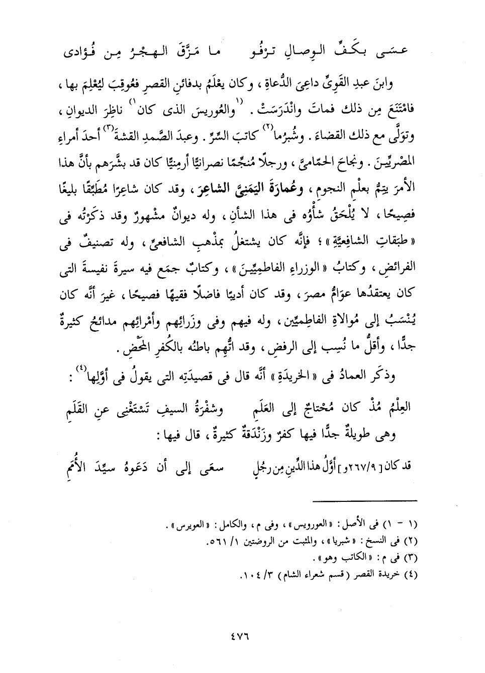 وَقَدْ كَانَ شَاعِرًا مُطَبِّقًا بَلِيغًا فَصِيحًا لَا يُلْحَقُ شَأْوُهُ فِي هَذَا الشَّأْنِ، وَلَهُ دِيوَانٌ مَشْهُورٌ، وَقَدْ ذَكَرْتُهُ فِي " طَبَقَاتِ الشَّافِعِيَّةِ " ; فَإِنَّهُ كَانَ يَشْتَغِلُ بِمَذْهَبِ الشَّافِعِيِّ، وَلَهُ تَصْنِيفٌ فِي الْفَرَائِضِ وَكِتَابُ " الْوُزَرَاءِ الْفَاطِمِيِّينَ " وَكِتَابٌ جَمَعَ فِيهِ سِيرَةَ نَفِيسَةَ الَّتِي كَانَ يَعْتَقِدُهَا عَوَّامُّ مِصْرَ، وَقَدْ كَانَ أَدِيبًا فَاضِلًا فَقِيهًا فَصِيحًا، غَيْرَ أَنَّهُ كَانَ يُنْسَبُ إِلَى مُوَالَاةِ الْفَاطِمِيِّينَ، وَلَهُ فِيهِمْ وَفِي وُزَرَائِهِمْ وَأُمَرَائِهِمْ مَدَائِحُ كَثِيرَةٌ جِدًّا، وَأَقَلُّ مَا نُسِبَ إِلَى الرَّفْضِ وَقَدِ اتُّهِمَ بَاطِنُهُ بِالْكُفْرِ الْمَحْضِ.
