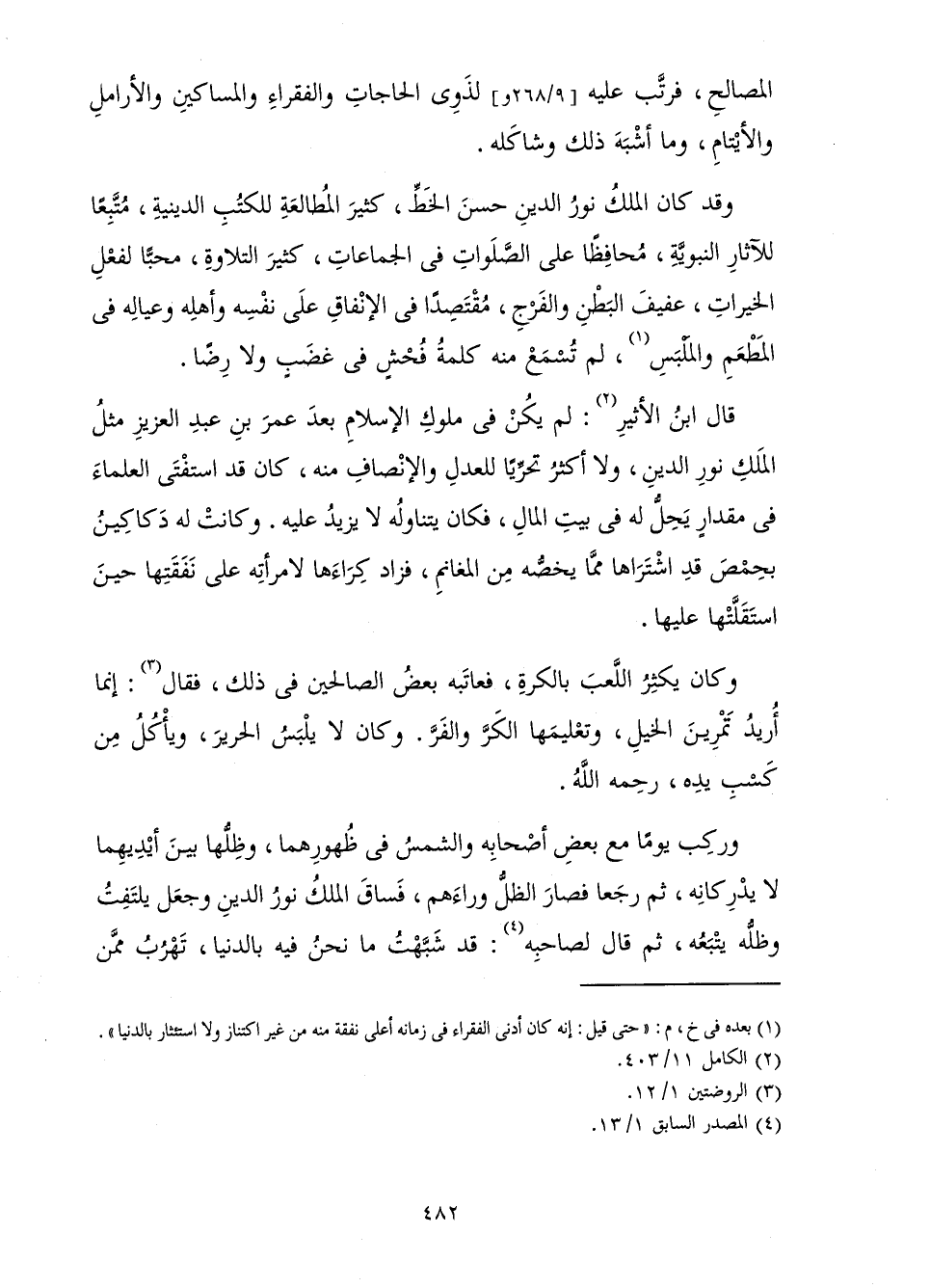 وَقَدْ كَانَ الْمَلِكُ نُورُ الدِّينِ حَسَنَ الْخَطِّ كَثِيرَ الْمُطَالَعَةِ لِلْكُتُبِ الدِّينِيَّةِ، مُتَّبِعًا لِلْآثَارِ النَّبَوِيَّةِ، مُحَافِظًا عَلَى الصَّلَوَاتِ فِي الْجَمَاعَاتِ، كَثِيرَ التِّلَاوَةِ مُحِبًّا لِفِعْلِ الْخَيْرَاتِ، عَفِيفَ الْبَطْنِ وَالْفَرْجِ، مُقْتَصِدًا فِي الْإِنْفَاقِ عَلَى نَفْسِهِ وَأَهْلِهِ وَعِيَالِهِ فِي الْمَطْعَمِ وَالْمَلْبَسِ، وَلَمْ تُسْمَعْ مِنْهُ كَلِمَةُ فُحْشٍ قَطُّ فِي غَضَبٍ وَلَا رِضًا.