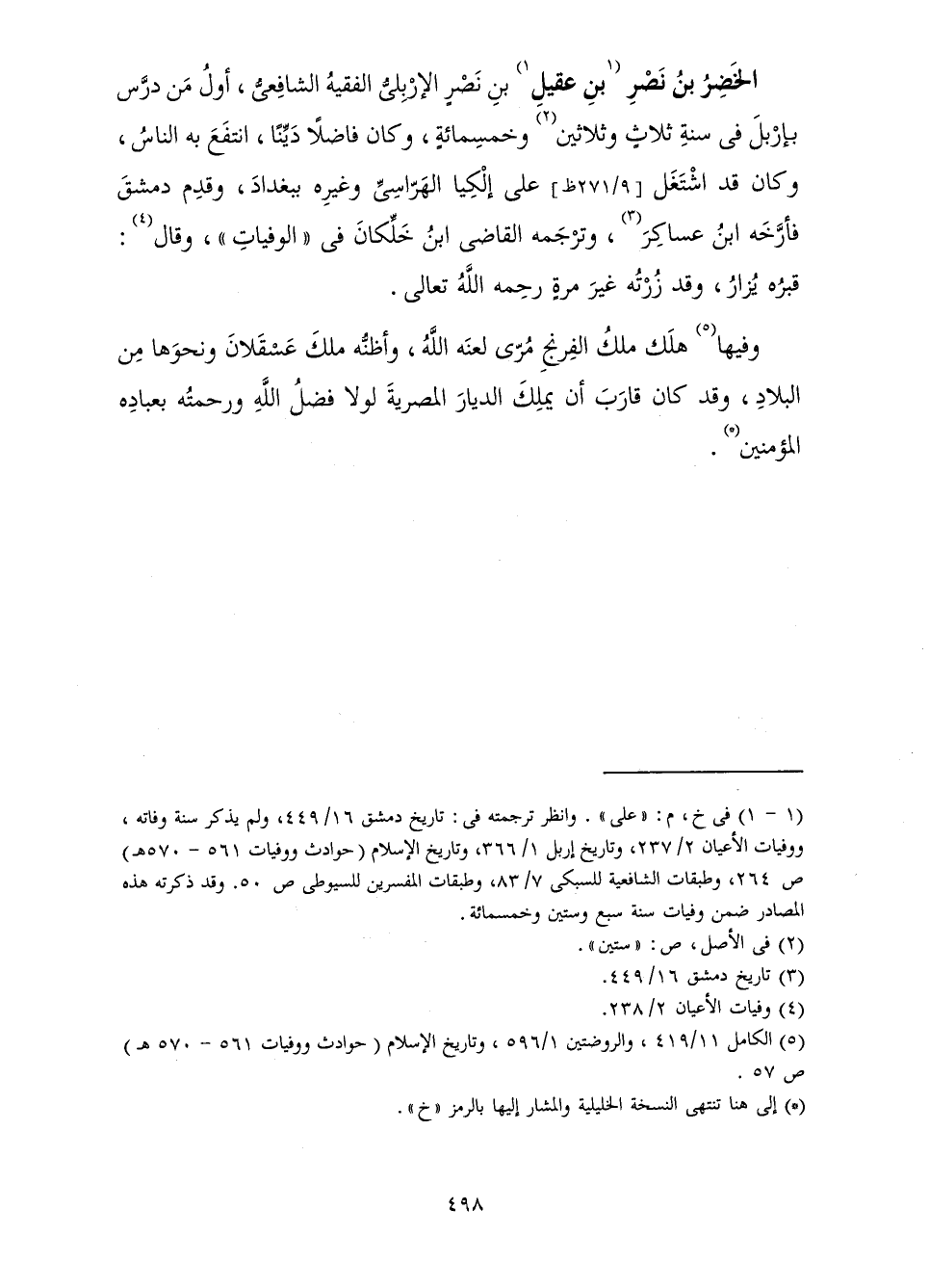 بْنِ نَصْرٍ، الْإِرْبِلِيُّ الْفَقِيهُ الشَّافِعِيُّ، أَوَّلُ مَنْ دَرَّسَ بِإِرْبِلَ فِي سَنَةِ ثَلَاثٍ وَثَلَاثِينَ وَخَمْسِمِائَةٍ، وَكَانَ فَاضِلًا دَيِّنًا انْتَفَعَ بِهِ النَّاسُ وَكَانَ قَدِ اشْتَغَلَ عَلَى إِلِكْيَا الْهَرَّاسِيِّ وَغَيْرِهِ بِبَغْدَادَ وَقَدِمَ دِمَشْقَ، فَأَرَّخَهُ ابْنُ عَسَاكِرَ وَتَرْجَمَهُ الْقَاضِي ابْنُ خَلِّكَانَ فِي " الْوَفِيَّاتِ "، وَقَالَ: قَبْرُهُ يُزَارُ، وَقَدْ زُرْتُهُ غَيْرَ مَرَّةٍ رَحِمَهُ اللَّهُ تَعَالَى.