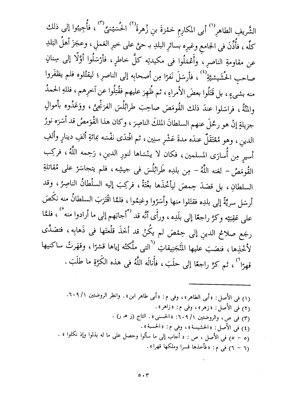 الشَّرِيفِ الطَّاهِرِ أَبِي الْمَكَارِمِ حَمْزَةَ بْنِ زَهْرَةَ الْحُسَيْنِيِّ فَأُجِيبُوا إِلَى ذَلِكَ كُلِّهِ فَأُذِّنَ فِي الْجَامِعِ وَغَيْرِهِ بِسَائِرِ الْبَلَدِ بِ حَيِّ عَلَى خَيْرِ الْعَمَلِ، وَعَجَزَ أَهْلُ الْبَلَدِ عَنْ مُقَاوَمَةِ النَّاصِرِ، وَأَعْمَلُوا فِي مَكِيدَتِهِ كُلَّ خَاطِرٍ فَأَرْسَلُوا أَوَّلًا إِلَى سِنَانٍ صَاحِبِ الْحُشَيْشِيَّةِ فَأَرْسَلَ نَفَرًا مِنْ أَصْحَابِهِ إِلَى النَّاصِرِ ; لِيَقْتُلُوهُ فَلَمْ يَظْفَرُوا مِنْهُ بِشَيْءٍ، بَلْ قَتَلُوا بَعْضَ الْأُمَرَاءِ، ثُمَّ ظَهَرَ عَلَيْهِمْ فَقُتِلُوا عَنْ آخِرِهِمْ فَلِلَّهِ الْحَمْدُ وَالْمِنَّةُ، فَرَاسَلُوا عِنْدَ ذَلِكَ الْقُومَصَ صَاحِبَ طَرَابُلُسَ الْفِرِنْجيَّ، وَوَعَدُوهُ بِأَمْوَالٍ جَزِيلَةٍ إِنْ هُوَ رَحَّلَ عَنْهُمُ السُّلْطَانَ الْمَلِكَ النَّاصِرَ، وَكَانَ هَذَا الْقُومَصُ قَدْ أَسَرَهُ نُورُ الدِّينِ وَهُوَ مُعْتَقَلٌ عِنْدَهُ مُدَّةَ عَشْرِ سِنِينَ، ثُمَّ افْتَدَى نَفْسَهُ بِمِائَةِ أَلْفِ دِينَارٍ وَأَلْفِ أَسِيرٍ مِنْ أُسَارَى الْمُسْلِمِينَ، فَكَانَ لَا يَنْسَاهَا لِنُورِ الدِّينِ رَحِمهُ اللَّهُ، فَرَكِبَ الْقُومَصُ - لَعَنَهُ اللَّهُ - مِنْ بَلَدِهِ طَرَابُلُسَ فِي جَيْشِهِ، فَلَمْ يَتَجَاسَرْ عَلَى مُقَاتَلَةِ السُّلْطَانِ، بَلْ قَصَدَ حِمْصَ لِيَأْخُذَهَا بَغْتَةً، فَرَكِبَ إِلَيْهِ السُّلْطَانُ النَّاصِرُ، وَقَدْ أَرْسَلَ سَرِيَّةً إِلَى بَلَدِهِ فَقَتَلُوا مِنْهَا وَأَسَرُوا وَغَنِمُوا، فَلَمَّا اقْتَرَبَ السُّلْطَانُ مِنْهُ نَكَصَ عَلَى عَقِبَيْهِ وَكَرَّ رَاجِعًا إِلَى بَلَدِهِ، وَرَأَى أَنَّهُ قَدْ أَجَابَهُمْ إِلَى مَا أَرَادُوا مِنْهُ، فَلَمَّا رَجَعَ صَلَاحُ الدِّينِ إِلَى حِمْصَ لَمْ يَكُنْ قَدْ أَخَذَ قَلْعَتَهَا فِي ذَهَابِهِ فَتَصَدَّى لِأَخْذِهَا فَنَصَبَ عَلَيْهَا الْمَنْجَنِيقَاتِ الَّتِي مَلَّكَتْهُ إِيَّاهَا قَسْرًا، وَقَهَرَتْ سَاكِنِيهَا قَهْرًا، ثُمَّ كَرَّ رَاجِعًا إِلَى حَلَبَ فَأَنَالَهُ اللَّهُ فِي هَذِهِ الْكَرَّةِ مَا طَلَبَ.