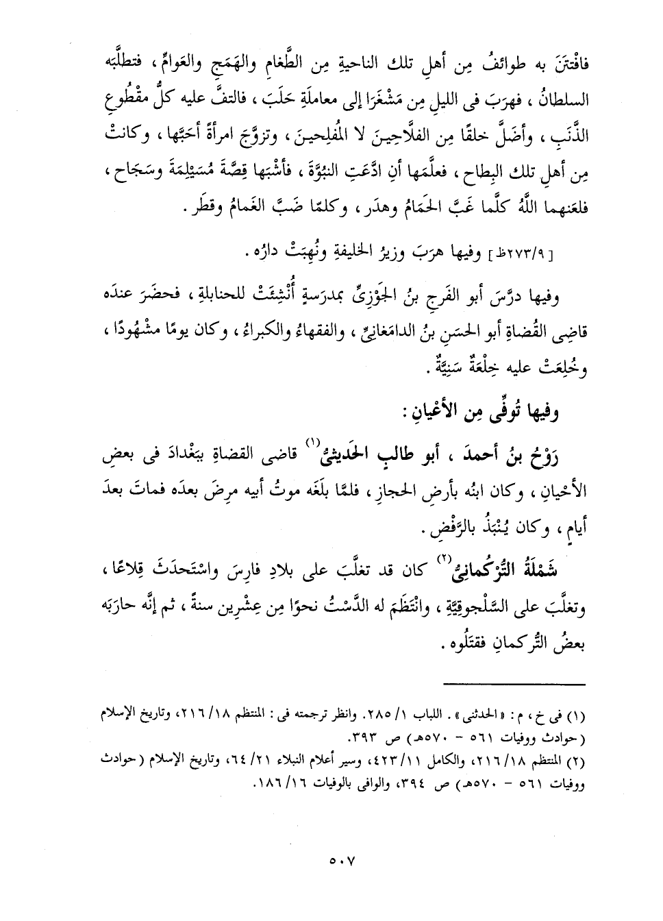 وَفِيهَا دَرَّسَ أَبُو الْفَرَجِ بْنُ الْجَوْزِيِّ بِمَدْرَسَةٍ أُنْشِئَتْ لِلْحَنَابِلَةِ فَحَضَرَ عِنْدَهُ قَاضِي الْقُضَاةِ أَبُو الْحَسَنِ بْنُ الدَّامَغَانِيِّ وَالْفُقَهَاءُ وَالْكُبَرَاءُ وَكَانَ يَوْمًا مَشْهُودًا وَخُلِعَتْ عَلَيْهِ خِلْعَةٌ سَنِيَّةٌ.