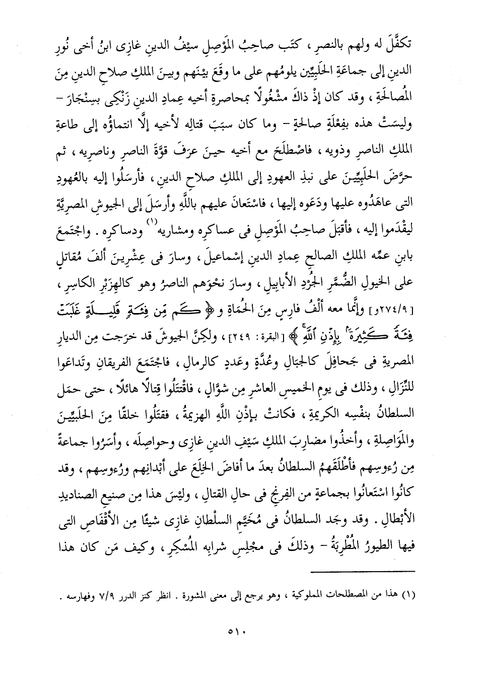تَكَفَّلَ لَهُ وَلَهُمْ بِالنَّصْرِ كَتَبَ صَاحِبُ الْمَوْصِلِ سَيْفُ الدِّينِ غَازِيٌّ ابْنُ أَخِي نُورِ الدِّينِ إِلَى جَمَاعَةِ الْحَلَبِيِّينَ يَلُومُهُمْ عَلَى مَا وَقَعَ بَيْنَهُمْ وَبَيْنَ الْمَلِكِ صَلَاحِ الدِّينِ مِنَ الْمُصَالَحَةِ، وَقَدْ كَانَ إِذْ ذَاكَ مَشْغُولًا بِمُحَاصَرَةِ أَخِيهِ عِمَادِ الدِّينِ زَنْكِيٍّ بِسِنْجَارَ - وَلَيْسَتْ هَذِهِ بِفِعْلَةٍ صَالِحَةٍ - وَمَا كَانَ سَبَبُ قِتَالِهِ لِأَخِيهِ إِلَّا انْتِمَاؤُهُ إِلَى طَاعَةِ الْمَلِكِ النَّاصِرِ وَذَوِيهِ فَاصْطَلَحَ مَعَ أَخِيهِ حِينَ عَرَفَ قُوَّةَ النَّاصِرِ وَنَاصِرِيهِ، ثُمَّ حَرَّضَ الْحَلَبِيِّينَ عَلَى نَبْذِ الْعُهُودِ إِلَى الْمَلِكِ صَلَاحِ الدِّينِ، فَأَرْسَلُوا إِلَيْهِ بِالْعُهُودِ الَّتِي عَاهَدُوهُ عَلَيْهَا وَدَعَوْهُ إِلَيْهَا، فَاسْتَعَانَ عَلَيْهِمْ بِاللَّهِ وَأَرْسَلَ إِلَى الْجُيُوشِ الْمِصْرِيَّةِ لِيَقْدَمُوا إِلَيْهِ فَأَقْبَلَ صَاحِبُ الْمَوْصِلِ فِي عَسَاكِرِهِ وَمُشَارِيهِ وَدَسَاكِرِهِ. وَاجْتَمَعَ بِابْنِ عَمِّهِ الْمَلِكِ الصَّالِحِ عِمَادِ الدِّينِ إِسْمَاعِيلَ، وَسَارَ فِي عِشْرِينَ أَلْفَ مُقَاتِلٍ عَلَى الْخُيُولِ الضُّمَّرِ الْجُرْدِ الْأَبَابِيلِ، وَسَارَ نَحْوَهُمُ النَّاصِرُ وَهُوَ كَالْهِزَبْرِ الْكَاسِرِ، وَإِنَّمَا مَعَهُ أَلْفُ فَارِسٍ مِنَ الْحُمَاةِ وَ {كَمْ مِنْ فِئَةٍ قَلِيلَةٍ غَلَبَتْ فِئَةً كَثِيرَةً بِإِذْنِ اللَّهِ} [البقرة: 249] وَلَكِنَّ الْجُيُوشَ قَدْ خَرَجَتْ مِنَ الدِّيَارِ الْمِصْرِيَّةِ فِي جَحَافِلَ كَالْجِبَالِ وَعُدَّةٍ وَعَدَدٍ كَالرِّمَالِ، فَاجْتَمَعَ الْفَرِيقَانِ وَتَدَاعَوْا لِلنِّزَالِ، وَذَلِكَ فِي يَوْمِ الْخَمِيسِ الْعَاشِرِ مِنْ شَوَّالٍ فَاقْتَتَلُوا قِتَالًا هَائِلًا، حَتَّى حَمَلَ السُّلْطَانُ بِنَفْسِهِ الْكَرِيمَةِ، وَكَانَتْ بِإِذْنِ اللَّهِ الْهَزِيمَةُ، فَقَتَلُوا خَلْقًا مِنَ الْحَلَبِيِّينَ وَالْمَوَاصِلَةِ وَأَخَذُوا مَضَارِبَ الْمَلِكِ سَيْفِ الدِّينِ غَازِيٍّ وَحَوَاصِلَهُ وَأَسَرُوا جَمَاعَةً مِنْ رُءُوسِهِمْ فَأَطْلَقَهُمُ السُّلْطَانُ بَعْدَمَا أَفَاضَ الْخِلَعَ عَلَى أَبْدَانِهِمْ وَرُءُوسِهِمْ، وَقَدْ كَانُوا اسْتَعَانُوا بِجَمَاعَةٍ مِنَ الْفِرِنْجِ فِي حَالِ الْقِتَالِ، وَلَيْسَ هَذَا مِنْ صَنِيعِ الصَّنَادِيدِ الْأَبْطَالِ. وَقَدْ وَجَدَ السُّلْطَانُ فِي مُخَيَّمِ السُّلْطَانِ غَازِيٍّ شَيْئًا مِنَ الْأَقْفَاصِ الَّتِي فِيهَا الطُّيُورُ الْمُطْرِبَةُ - وَذَلِكَ فِي مَجْلِسِ شَرَابِهِ الْمُسْكِرِ - وَكَيْفَ مَنْ كَانَ هَذَا