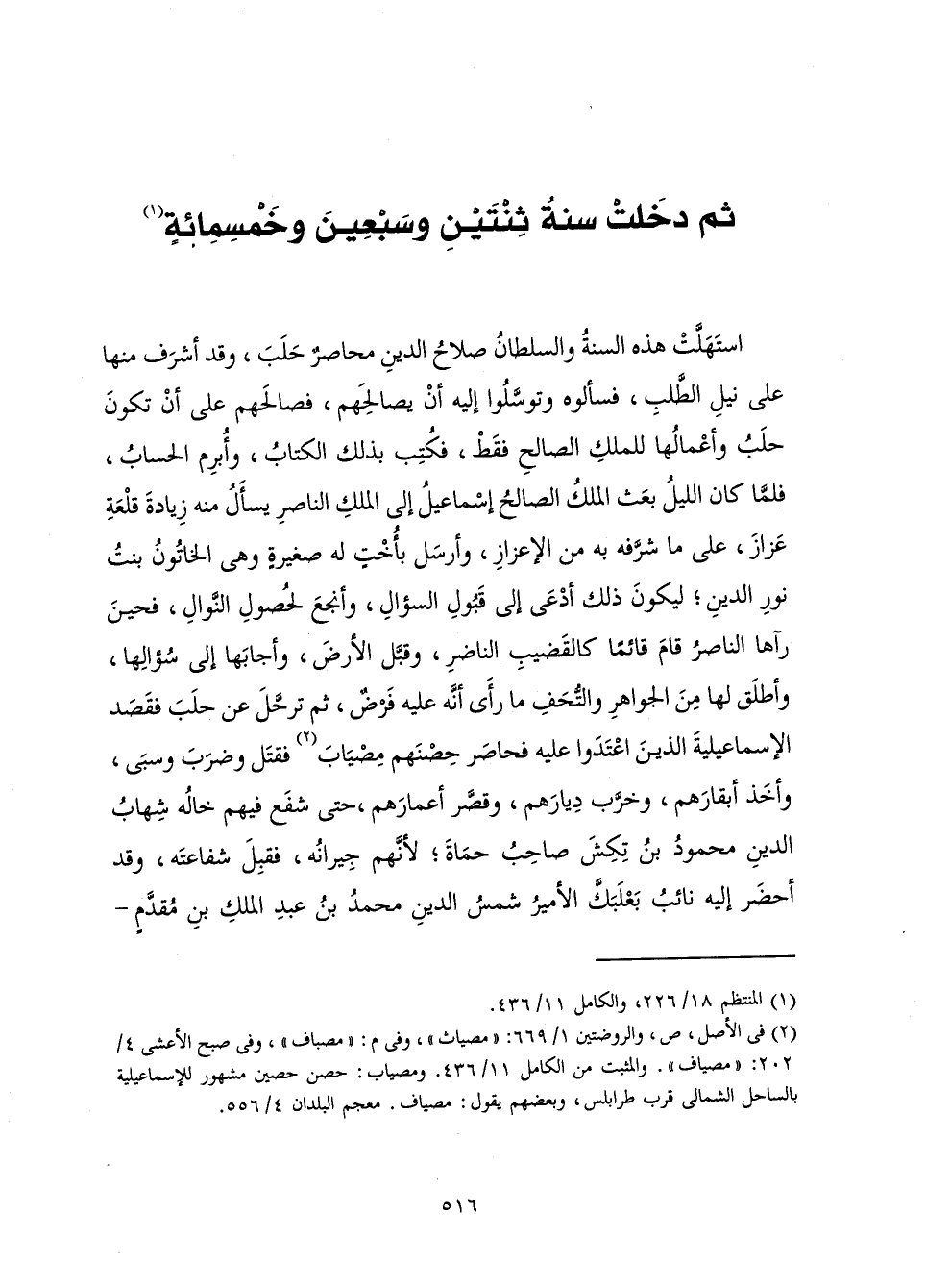 اسْتُهِلَّتْ هَذِهِ السَّنَةُ وَالسُّلْطَانُ صَلَاحُ الدِّينِ مُحَاصِرٌ حَلَبَ وَقَدْ أَشْرَفَ مِنْهَا عَلَى نَيْلِ الطَّلَبِ، فَسَأَلُوهُ وَتَوَسَّلُوا إِلَيْهِ أَنْ يُصَالِحَهُمْ، فَصَالَحَهُمْ عَلَى أَنْ تَكُونَ حَلَبُ وَأَعْمَالُهَا لِلْمَلِكِ الصَّالِحِ فَقَطْ، فَكُتِبَ بِذَلِكَ الْكِتَابُ، وَأُبْرِمَ الْحِسَابُ، فَلَمَّا كَانَ اللَّيْلُ بَعَثَ الْمَلِكُ الصَّالِحُ إِسْمَاعِيلُ إِلَى الْمَلِكِ النَّاصِرِ يَسْأَلُ مِنْهُ زِيَادَةَ قَلْعَةِ عَزَازَ، عَلَى مَا شَرَّفَهُ بِهِ مِنَ الْإِعْزَازِ، وَأَرْسَلَ بِأُخْتٍ لَهُ صَغِيرَةٍ وَهِيَ الْخَاتُونُ بِنْتُ نُورِ الدِّينِ ; لِيَكُونَ ذَلِكَ أَدْعَى إِلَى قَبُولِ السُّؤَالِ، وَأَنْجَعَ لِحُصُولِ النَّوَالِ، فَحِينَ رَآهَا النَّاصِرُ قَامَ كَالْقَضِيبِ النَّاضِرِ، وَقَبَّلَ الْأَرْضَ، وَأَجَابَهَا إِلَى سُؤَالِهَا، وَأَطْلَقَ لَهَا مِنَ الْجَوَاهِرِ وَالتُّحَفِ مَا رَأَى أَنَّهُ عَلَيْهِ فَرْضٌ، ثُمَّ تَرَحَّلَ عَنْ حَلَبَ فَقَصَدَ الْإِسْمَاعِيلِيَّةَ الَّذِينَ اعْتَدَوْا عَلَيْهِ فَحَاصَرَ حِصْنَهُمْ مِصْيَابَ فَقَتَلَ وَضَرَبَ وَسَبَى، وَأَخَذَ أَبْقَارَهُمْ، وَخَرَّبَ دِيَارَهُمْ، وَقَصَّرَ أَعْمَارَهُمْ، حَتَّى شَفَعَ فِيهِمْ خَالُهُ شِهَابُ الدِّينِ مَحْمُودُ بْنُ تِكِشَ صَاحِبُ حَمَاةَ ; لِأَنَّهُمْ جِيرَانُهُ، فَقَبِلَ شَفَاعَتَهُ، وَقَدْ أَحْضَرَ إِلَيْهِ نَائِبُ بَعْلَبَكَّ الْأَمِيرُ شَمْسُ الدِّينِ مُحَمَّدُ بْنُ عَبْدِ الْمَلِكِ بْنِ مُقَدَّمٍ -