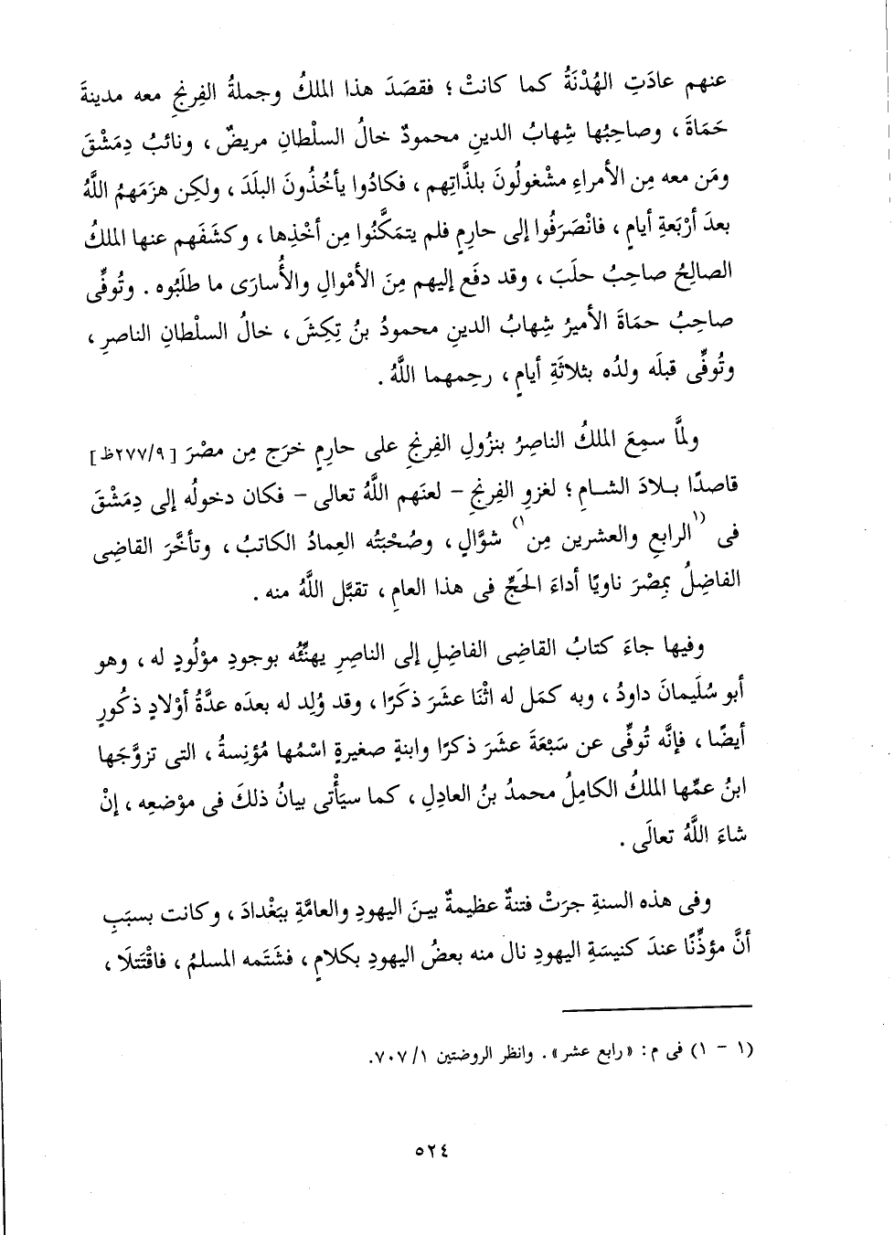 عَنْهُمْ عَادَتِ الْهُدْنَةُ كَمَا كَانَتْ ; فَقَصَدَ هَذَا الْمَلِكُ وَجُمْلَةُ الْفِرِنْجِ مَعَهُ مَدِينَةَ حَمَاةَ، وَصَاحِبُهَا شِهَابُ الدِّينِ مَحْمُودٌ خَالُ السُّلْطَانِ مَرِيضٌ، وَنَائِبُ دِمَشْقَ وَمَنْ مَعَهُ مِنَ الْأُمَرَاءِ مَشْغُولُونَ بِلَذَّاتِهِمْ، فَكَادُوا يَأْخُذُونَ الْبَلَدَ، وَلَكِنْ هَزَمَهُمُ اللَّهُ بَعْدَ أَرْبَعَةِ أَيَّامٍ، فَانْصَرَفُوا إِلَى حَارِمٍ فَلَمْ يَتَمَكَّنُوا مِنْ أَخْذِهَا، وَكَشْفَهُمْ عَنْهَا الْمَلِكُ الصَّالِحُ صَاحِبُ حَلَبَ وَقَدْ دَفَعَ إِلَيْهِمْ مِنَ الْأَمْوَالِ وَالْأُسَارَى مَا طَلَبُوهُ. وَتُوُفِّيَ صَاحِبُ حَمَاةَ الْأَمِيرُ شِهَابُ الدِّينِ مَحْمُودُ بْنُ تِكِشَ، خَالُ السُّلْطَانِ النَّاصِرِ، وَتُوُفِّيَ قَبْلَهُ وَلَدُهُ بِثَلَاثَةِ أَيَّامٍ، رَحِمَهُمَا اللَّهُ.