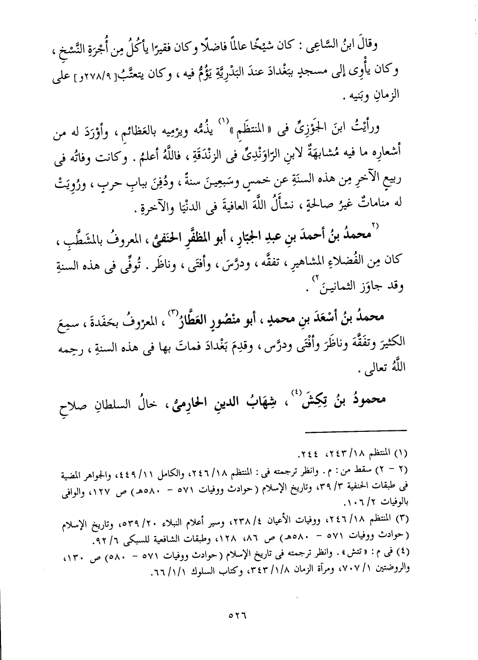مُحَمَّدُ بْنُ أَحْمَدَ بْنِ عَبْدِ الْجَبَّارِ، أَبُو الْمُظَفَّرِ الْحَنَفِيُّ، الْمَعْرُوفُ بِالْمُشَطَّبِ، كَانَ مِنَ الْفُضَلَاءِ الْمَشَاهِيرِ، تَفَقَّهَ، وَدَرَسَ، وَأَفْتَى، وَنَاظَرَ. تُوُفِّيَ فِي هَذِهِ السَّنَةِ وَقَدْ جَاوَزَ الثَّمَانِينَ.