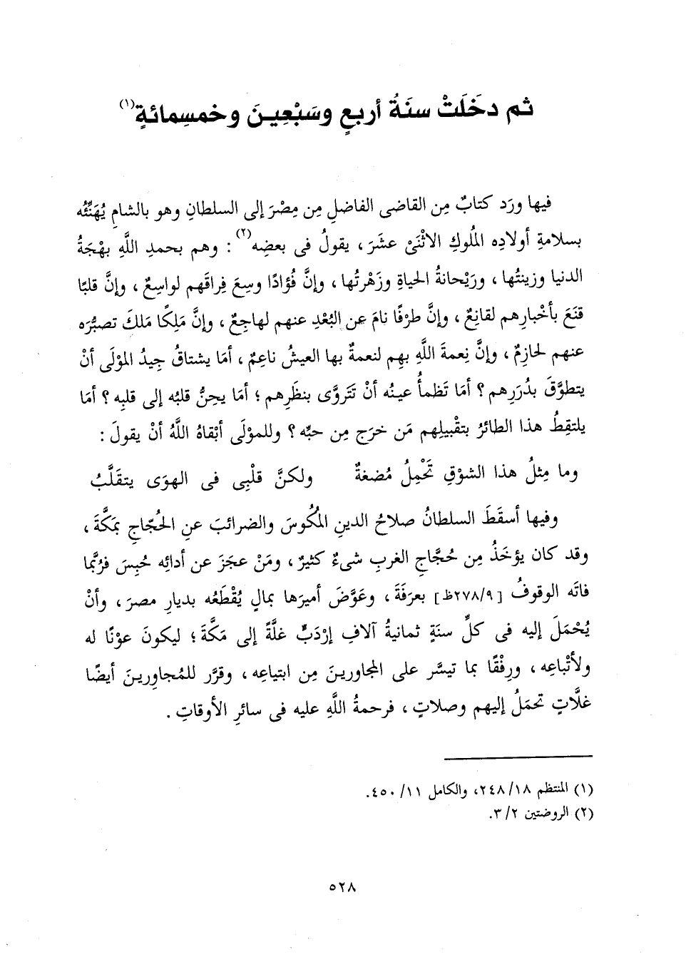 وَفِيهَا أَسْقَطَ السُّلْطَانُ صَلَاحُ الدِّينِ الْمُكُوسَ وَالضَّرَائِبَ عَنِ الْحُجَّاجِ بِمَكَّةَ، وَقَدْ كَانَ يُؤْخَذُ مِنْ حُجَّاجِ الْغَرْبِ شَيْءٌ كَثِيرٌ، وَمَنْ عَجَزَ عَنْ أَدَائِهِ حُبِسَ فَرُبَّمَا فَاتَهُ الْوُقُوفُ بِعَرَفَةَ، وَعَوَّضَ أَمِيرَهَا بِمَالٍ يُقْطَعُهُ بِدِيَارِ مِصْرَ، وَأَنْ يُحْمَلَ إِلَيْهِ فِي كُلِّ سَنَةٍ ثَمَانِيَةُ آلَافِ إِرْدَبٍّ غَلَّةً إِلَى مَكَّةَ ; لِيَكُونَ عَوْنًا لَهُ وَلِأَتْبَاعِهِ، وَرِفْقًا بِمَا تَيَسَّرَ عَلَى الْمُجَاوِرِينَ مِنَ ابْتِيَاعِهِ، وَقَرَّرَ لِلْمُجَاوِرِينَ أَيْضًا غَلَّاتٍ تُحْمَلُ إِلَيْهِمْ، فَرَحْمَةُ اللَّهِ عَلَيْهِ فِي سَائِرِ الْأَوْقَاتِ.