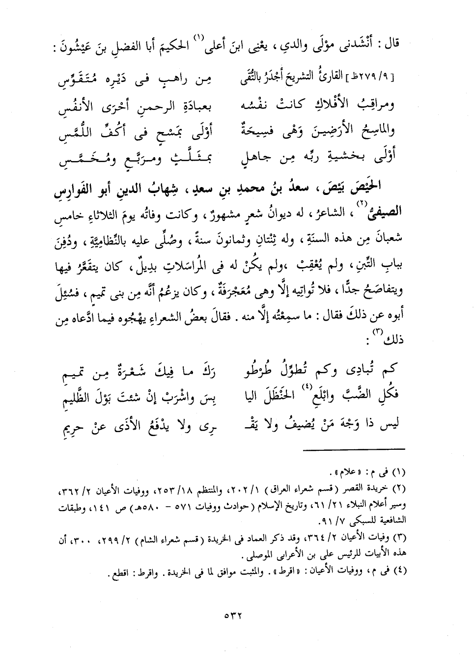 سَعْدُ بْنُ مُحَمَّدِ بْنِ سَعْدٍ، شِهَابُ الدِّينِ أَبُو الْفَوَارِسِ الصَّيْفِيُّ، الشَّاعِرُ، لَهُ دِيوَانُ شِعْرٍ مَشْهُورٍ، وَكَانَتْ وَفَاتُهُ يَوْمَ الثُّلَاثَاءِ خَامِسَ شَعْبَانَ مِنْ هَذِهِ السَّنَةِ، وَلَهُ اثْنَتَانِ وَثَمَانُونَ سَنَةً، وَصُلِّيَ عَلَيْهِ بِالنِّظَامِيَّةِ، وَدُفِنَ بِبَابِ التِّبْنِ، وَلَمْ يُعْقِبْ، وَلَمْ يَكُنْ لَهُ فِي الْمُرَاسَلَاتِ بَدِيلٌ، كَانَ يَتَقَعَّرُ فِيهَا وَيَتَفَاصَحُ جِدًّا، فَلَا تُوَاتِيهِ إِلَّا وَهِيَ مُعَجْرَفَةٌ، وَكَانَ يَزْعُمُ أَنَّهُ مِنْ بَنِي تَمِيمٍ، فَسُئِلَ أَبُوهُ عَنْ ذَلِكَ فَقَالَ: مَا سَمِعْتُهُ إِلَّا مِنْهُ. فَقَالَ بَعْضُ الشُّعَرَاءِ يَهْجُوهُ فِيمَا ادَّعَاهُ مِنْ ذَلِكَ: