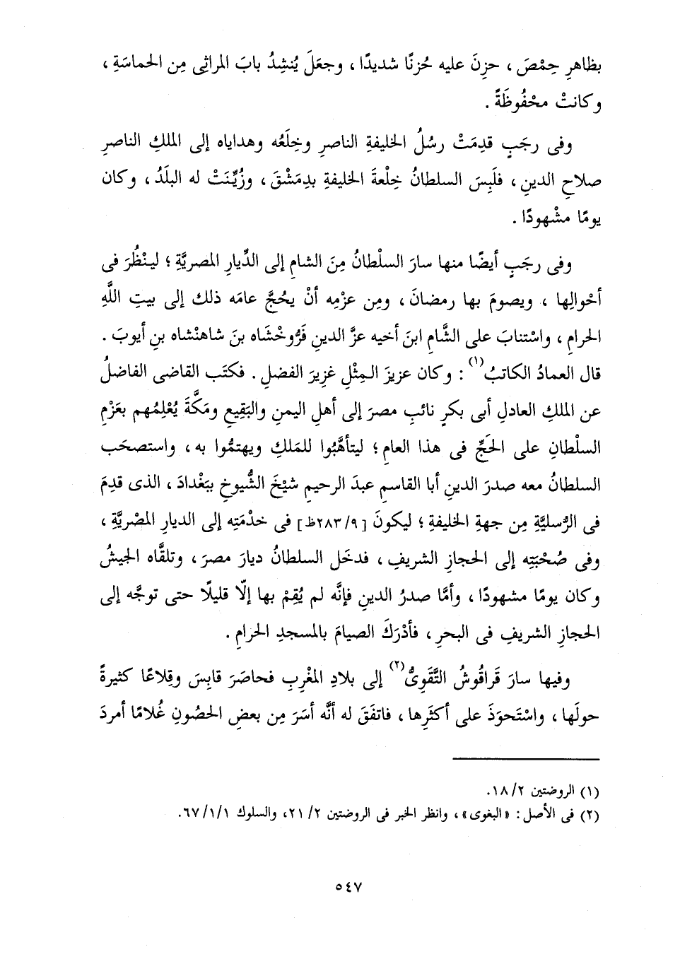 وَفِي رَجَبٍ قَدِمَتْ رُسُلُ الْخَلِيفَةِ النَّاصِرِ وَخِلَعُهُ وَهَدَايَا إِلَى الْمَلِكِ النَّاصِرِ صَلَاحِ الدِّينِ، فَلَبِسَ السُّلْطَانُ خِلْعَةَ الْخَلِيفَةِ بِدِمَشْقَ، وَزُيِّنَتْ لَهُ الْبَلَدُ، وَكَانَ يَوْمًا مَشْهُودًا.