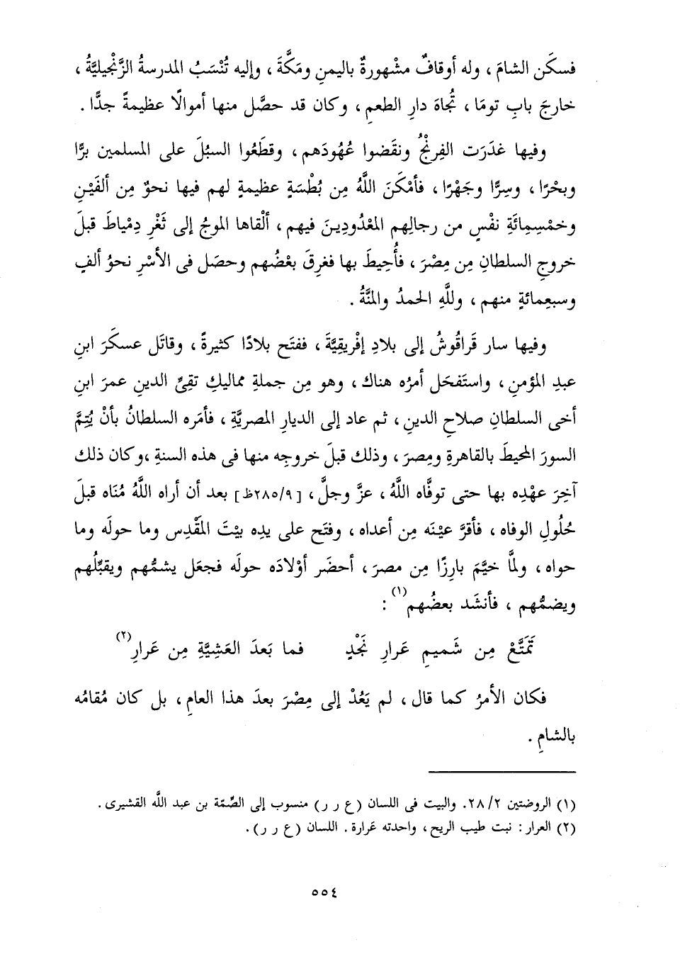 وَفِيهَا سَارَ قَرَاقُوشُ إِلَى بِلَادِ إِفْرِيقِيَّةَ، فَفَتَحَ بِلَادًا كَثِيرَةً، وَقَاتَلَ عَسْكَرَ ابْنِ عَبْدِ الْمُؤْمِنِ، وَاسْتَفْحَلَ أَمْرُهُ هُنَاكَ، وَهُوَ مِنْ جُمْلَةِ مَمَالِيكِ تَقِيِّ الدِّينِ عُمَرَ ابْنِ أَخِي السُّلْطَانِ صَلَاحِ الدِّينِ، ثُمَّ عَادَ إِلَى الدِّيَارِ الْمِصْرِيَّةِ، فَأَمَرَهُ السُّلْطَانُ بِأَنْ يُتِمَّ السُّورَ الْمُحِيطَ بِالْقَاهِرَةِ وَمِصْرَ، وَذَلِكَ قَبْلَ خُرُوجِهِ مِنْهَا فِي هَذِهِ السَّنَةِ، وَكَانَ ذَلِكَ آخِرَ عَهْدِهِ بِهَا حَتَّى تَوَفَّاهُ اللَّهُ، عَزَّ وَجَلَّ، بَعْدَ أَنْ أَرَاهُ اللَّهُ مُنَاهُ قَبْلَ حُلُولِ الْوَفَاةِ، فَأَقَرَّ عَيْنَهُ مِنْ أَعْدَاهُ، وَفَتَحَ عَلَى يَدِهِ بَيْتَ الْمَقْدِسِ وَمَا حَوْلَهُ وَمَا حَوَاهُ، وَلَمَّا خَيَّمَ بَارِزًا مِنْ مِصْرَ، أَحْضَرَ أَوْلَادَهُ حَوْلَهُ فَجَعَلَ يَشُمُّهُمْ وَيُقَبِّلُهُمْ وَيَضُمُّهُمْ، فَأَنْشَدَ بَعْضُهُمْ: