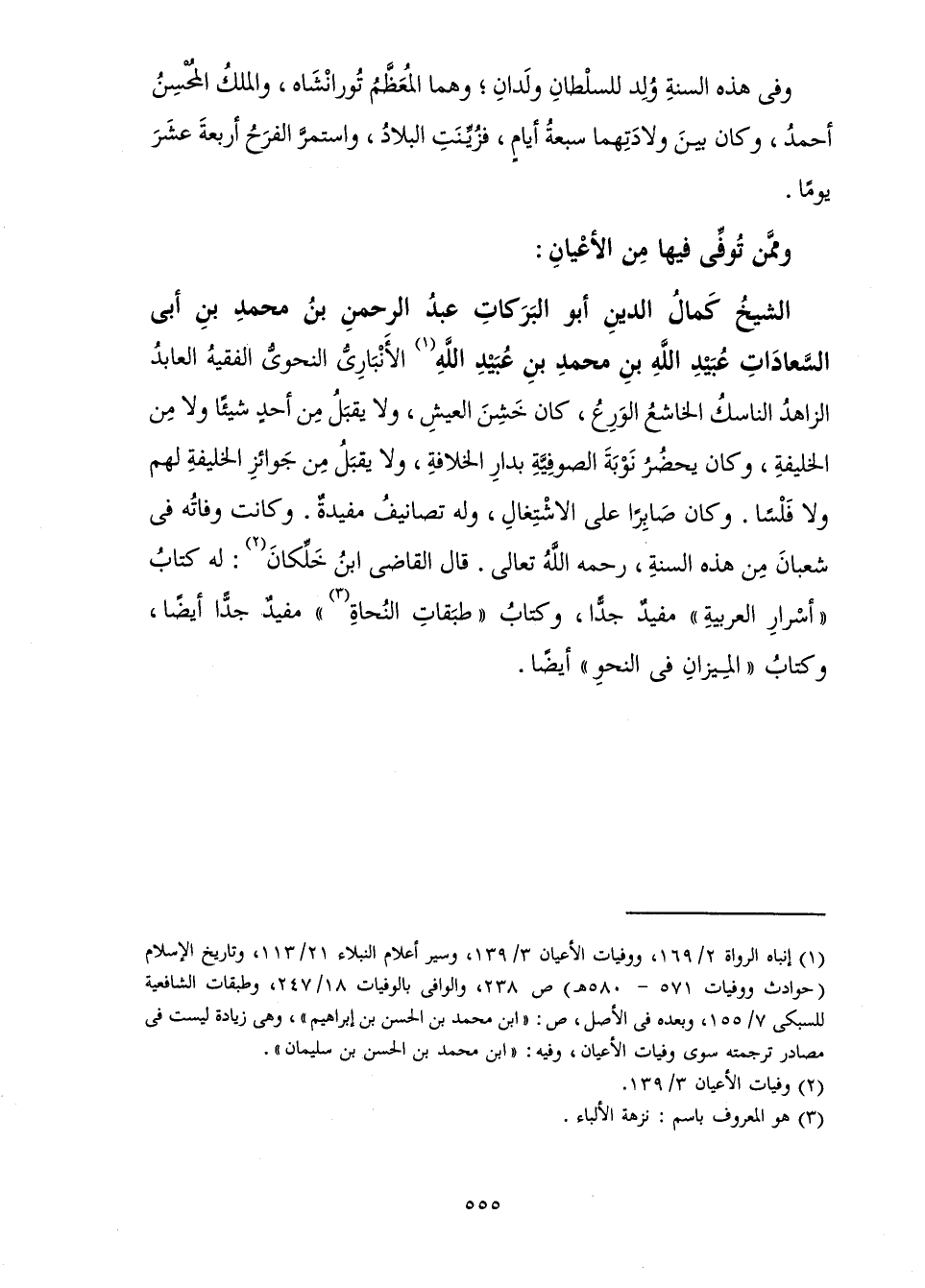 عَبْدُ الرَّحْمَنِ بْنُ مُحَمَّدِ بْنِ أَبِي السَّعَادَاتِ عُبَيْدِ اللَّهِ بْنِ مُحَمَّدِ بْنِ عُبَيْدِ اللَّهِ الْأَنْبَارِيُّ النَّحْوِيُّ الْفَقِيهُ الْعَابِدُ الزَّاهِدُ النَّاسِكُ الْخَاشِعُ الْوَرِعُ، كَانَ خَشِنَ الْعَيْشِ وَلَا يَقْبَلُ مِنْ أَحَدٍ شَيْئًا وَلَا مِنَ الْخَلِيفَةِ، وَكَانَ يَحْضُرُ نَوْبَةَ الصُّوفِيَّةِ بِدَارِ الْخِلَافَةِ، وَلَا يَقْبَلُ مِنْ جَوَائِزِ الْخَلِيفَةِ لَهُمْ وَلَا فَلْسًا. وَكَانَ صَابِرًا عَلَى الِاشْتِغَالِ، وَلَهُ تَصَانِيفُ مُفِيدَةٌ. وَكَانَتْ وَفَاتُهُ فِي شَعْبَانَ مِنْ هَذِهِ السَّنَةِ، رَحِمَهُ اللَّهُ تَعَالَى. قَالَ الْقَاضِي ابْنُ خَلِّكَانَ لَهُ كِتَابُ " أَسْرَارِ الْعَرَبِيَّةِ " مُفِيدٌ جِدًّا، وَكِتَابُ " طَبَقَاتِ النُّحَاةِ " مُفِيدٌ جِدًّا أَيْضًا، وَكِتَابُ " الْمِيزَانِ فِي النَّحْوِ " أَيْضًا.