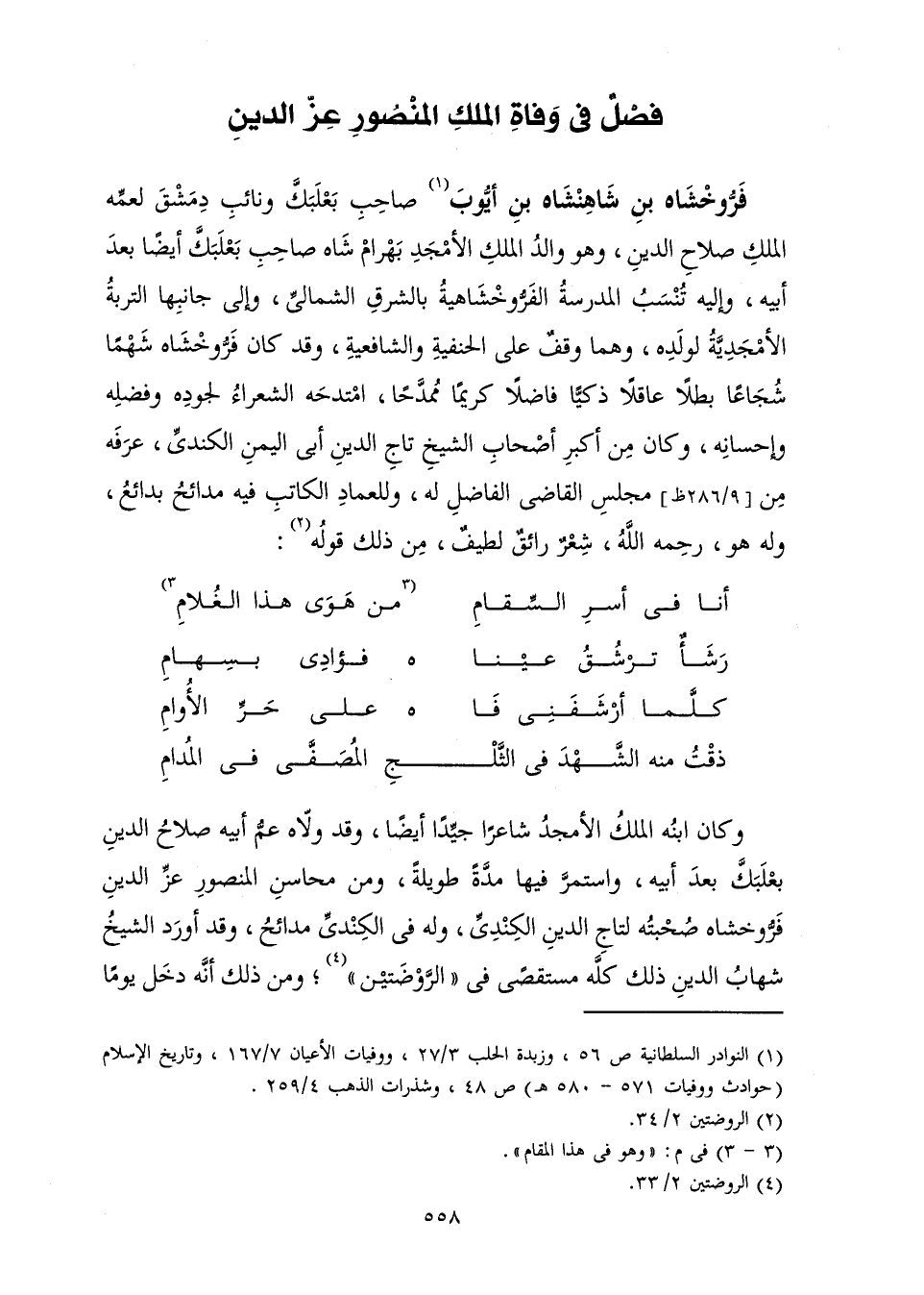 وَكَانَ ابْنُهُ الْمَلِكُ الْأَمْجَدُ شَاعِرًا جَيِّدًا أَيْضًا، وَقَدْ وَلَّاهُ عَمُّ أَبِيهِ صَلَاحُ الدِّينِ بَعْلَبَكَّ بَعْدَ أَبِيهِ، وَاسْتَمَرَّ فِيهَا مُدَّةً طَوِيلَةً، وَمِنْ مَحَاسِنِ الْمَنْصُورِ عِزِّ الدِّينِ فَرُّوخْشَاهْ صُحْبَتُهُ لِتَاجِ الدَّيْنِ الْكِنْدِيِّ، وَلَهُ فِي الْكِنْدِيِّ مَدَائِحُ، وَقَدْ أَوْرَدَ الشَّيْخُ شِهَابُ الدِّينِ ذَلِكَ كُلَّهُ مُسْتَقْصًى فِي " الرَّوْضَتَيْنِ " ; وَمِنْ ذَلِكَ أَنَّهُ دَخَلَ يَوْمًا