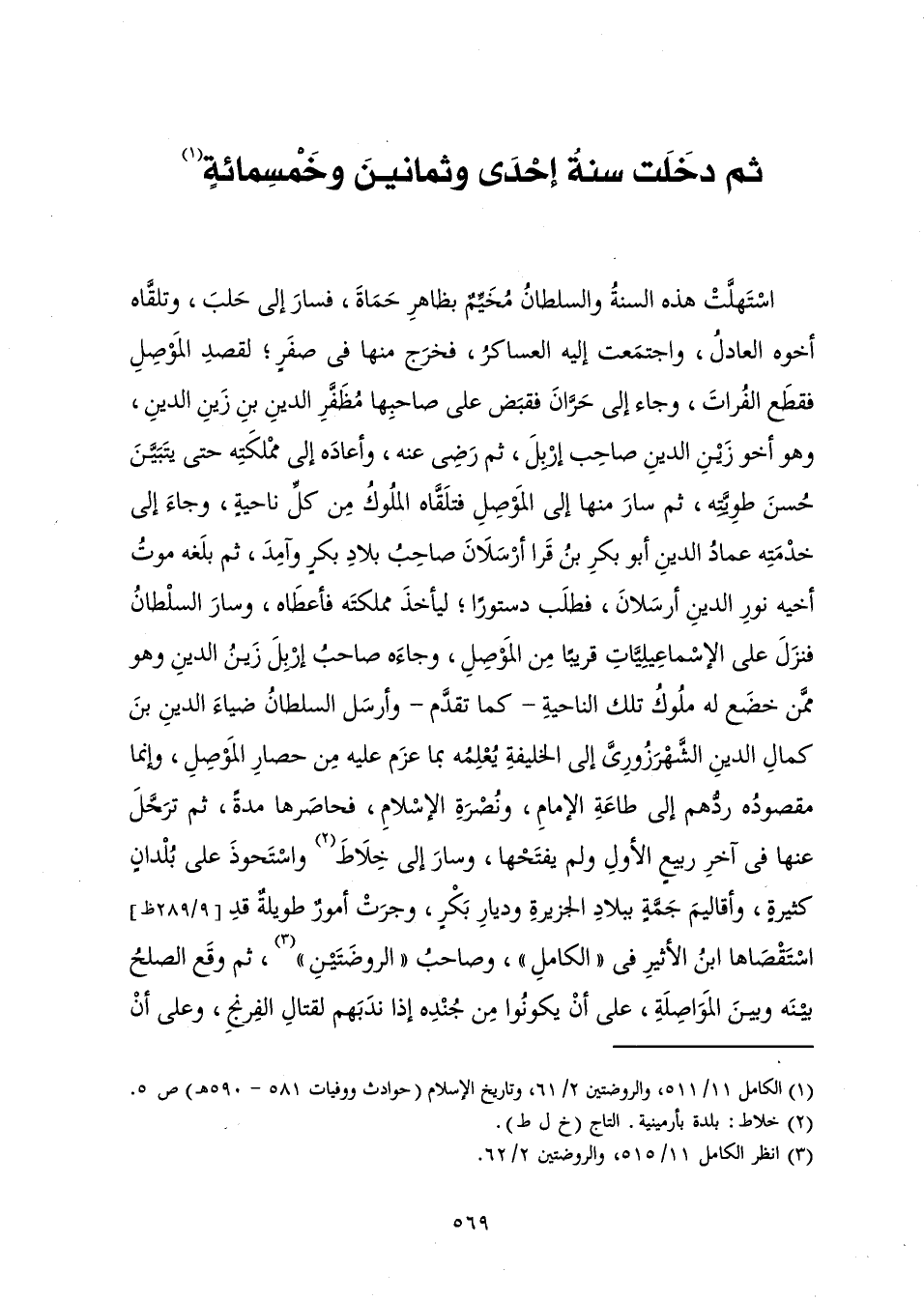 اسْتُهِلَّتْ هَذِهِ السَّنَةُ وَالسُّلْطَانُ مُخَيِّمٌ بِظَاهِرِ حَمَاةَ، فَسَارَ إِلَى حَلَبَ وَتَلَقَّاهُ أَخُوهُ الْعَادِلُ، وَاجْتَمَعَتْ إِلَيْهِ الْعَسَاكِرُ، فَخَرَجَ مِنْهَا فِي صَفَرٍ ; لِقَصْدِ الْمَوْصِلِ فَقَطَعَ الْفُرَاتَ، وَجَاءَ إِلَى حَرَّانَ فَقَبَضَ عَلَى صَاحِبِهَا مُظَفَّرِ الدِّينِ بْنِ زَيْنِ الدِّينِ، وَهُوَ أَخُو زَيْنِ الدِّينِ صَاحِبِ إِرْبِلَ، ثُمَّ رَضِيَ عَنْهُ، وَأَعَادَهُ إِلَى مَمْلَكَتِهِ حَتَّى يَتَبَيَّنَ حُسْنَ طَوِيَّتِهِ، ثُمَّ سَارَ مِنْهَا إِلَى الْمَوْصِلِ فَتَلَقَّاهُ الْمُلُوكُ مِنْ كُلِّ نَاحِيَةٍ، وَجَاءَ إِلَى خِدْمَتِهِ عِمَادُ الدِّينِ أَبُو بَكْرِ بْنُ قَرَا أَرْسَلَانَ صَاحِبُ بِلَادِ بِكْرٍ وَآمِدَ، ثُمَّ بَلَغَهُ مَوْتُ أَخِيهِ نُورِ الدِّينِ أَرْسَلَانَ، فَطَلَبَ دُسْتُورًا ; لِأَخْذِ مَمْلَكَتِهِ فَأَعْطَاهُ، وَسَارَ السُّلْطَانُ فَنَزَلَ عَلَى الْإِسْمَاعِيلِيَّاتِ قَرِيبًا مِنَ الْمَوْصِلِ وَجَاءَهُ صَاحِبُ إِرْبِلَ زَيْنُ الدِّينِ وَهُوَ مِمَّنْ خَضَعَ لَهُ مُلُوكُ تِلْكَ النَّاحِيَةِ - كَمَا تَقَدَّمَ - وَأَرْسَلَ السُّلْطَانُ ضِيَاءَ الدِّينِ بْنَ كَمَالِ الدِّينِ الشَّهْرُزُورِيَّ إِلَى الْخَلِيفَةِ يُعْلِمُهُ بِمَا عَزَمَ عَلَيْهِ مِنْ حِصَارِ الْمَوْصِلِ وَإِنَّمَا مَقْصُودُهُ رَدُّهُمْ إِلَى طَاعَةِ الْإِمَامِ، وَنُصْرَةِ الْإِسْلَامِ، فَحَاصَرَهَا مُدَّةً، ثُمَّ تَرَحَّلَ عَنْهَا فِي آخِرِ رَبِيعٍ الْأَوَّلِ وَلَمْ يَفْتَحْهَا، وَسَارَ إِلَى خِلَاطَ وَاسْتَحْوَذَ عَلَى بُلْدَانٍ كَثِيرَةٍ، وَأَقَالِيمَ جَمَّةٍ بِبِلَادِ الْجَزِيرَةِ وَدِيَارِ بَكْرٍ، وَجَرَتْ أُمُورٌ طَوِيلَةٌ قَدِ اسْتَقْصَاهَا ابْنُ الْأَثِيرِ فِي " الْكَامِلِ " وَصَاحِبُ " الرَّوْضَتَيْنِ "، ثُمَّ وَقَعَ الصُّلْحُ بَيْنَهُ وَبَيْنَ الْمَوَاصِلَةِ، عَلَى أَنْ يَكُونُوا مَنْ جُنْدِهِ إِذَا نَدَبَهُمْ لِقِتَالِ الْفِرِنْجِ، وَعَلَى أَنْ