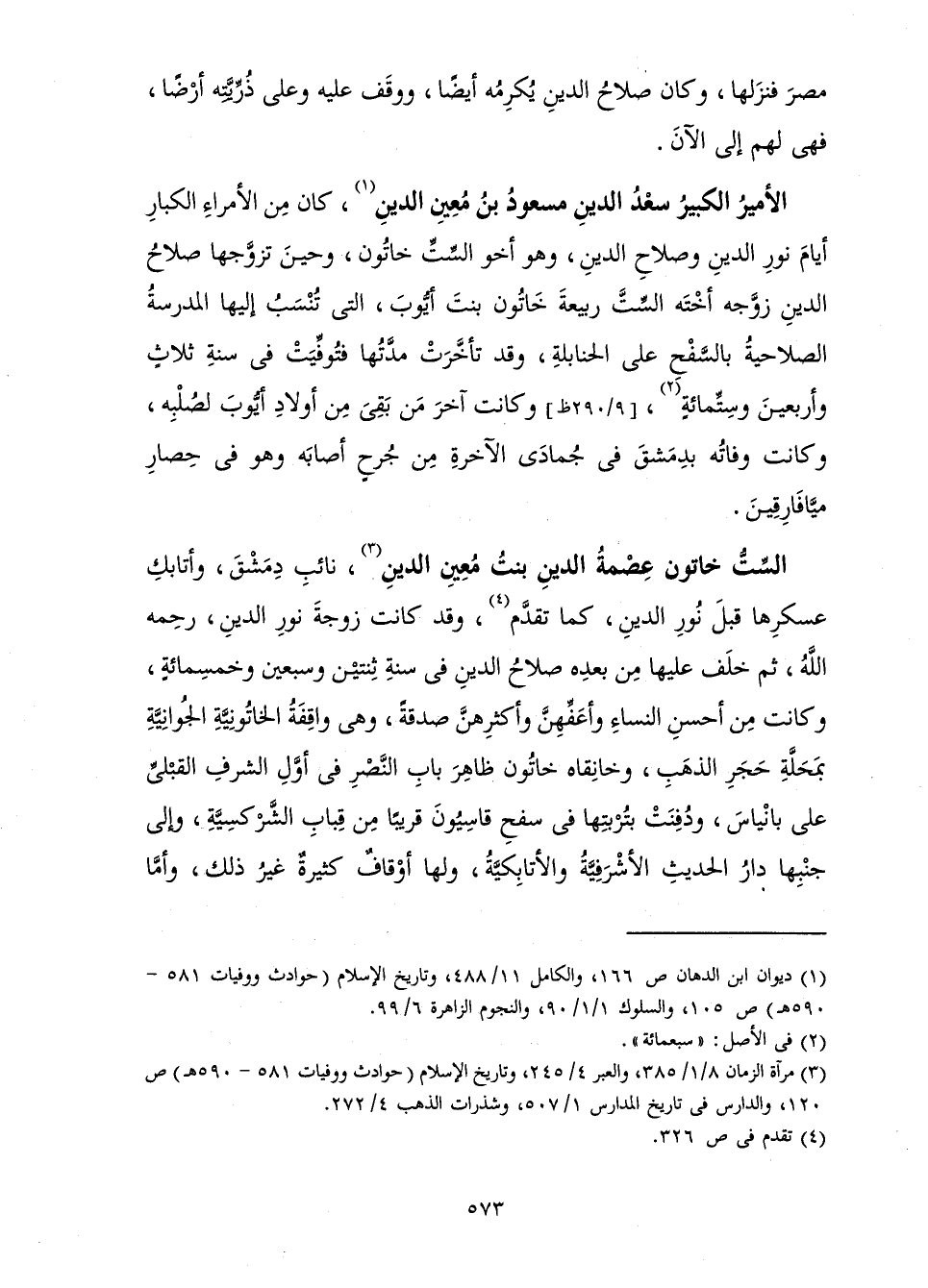 بِنْتُ مُعِينِ الدِّينِ، نَائِبِ دِمَشْقَ وَأَتَابِكِ عَسْكَرِهَا قَبْلَ نُورِ الدِّينِ، كَمَا تَقَدَّمَ، وَقَدْ كَانَتْ زَوْجَةَ نُورِ الدِّينِ، رَحِمَهُ اللَّهُ، ثُمَّ خَلَفَ عَلَيْهَا مِنْ بَعْدِهِ صَلَاحُ الدِّينِ فِي سَنَةِ ثِنْتَيْنِ وَسَبْعِينَ وَخَمْسِمِائَةٍ، وَكَانَتْ مِنْ أَحْسَنِ النِّسَاءِ وَأَعَفِّهِنَّ وَأَكْثَرِهِنَّ صَدَقَةً، وَهِيَ وَاقِفَةُ الْخَاتُونِيَّةِ الْجُوَانِيَّةِ بِمَحَلَّةِ حَجَرِ الذَّهَبِ، وَخَانِقَاهُ خَاتُونَ ظَاهِرَ بَابِ النَّصْرِ فِي أَوَّلِ الشَّرَفِ الْقِبْلِيِّ عَلَى بَانِيَاسَ وَدُفِنَتْ بِتُرْبَتِهَا فِي سَفْحِ قَاسِيُونَ قَرِيبًا مِنْ قِبَابِ الشَّرْكَسِيَّةِ، وَإِلَى جَنْبِهَا دَارُ الْحَدِيثِ الْأَشْرَفِيَّةُ وَالْأَتَابِكِيَّةُ، وَلَهَا أَوْقَافٌ كَثِيرَةٌ غَيْرُ ذَلِكَ، وَأمَّا