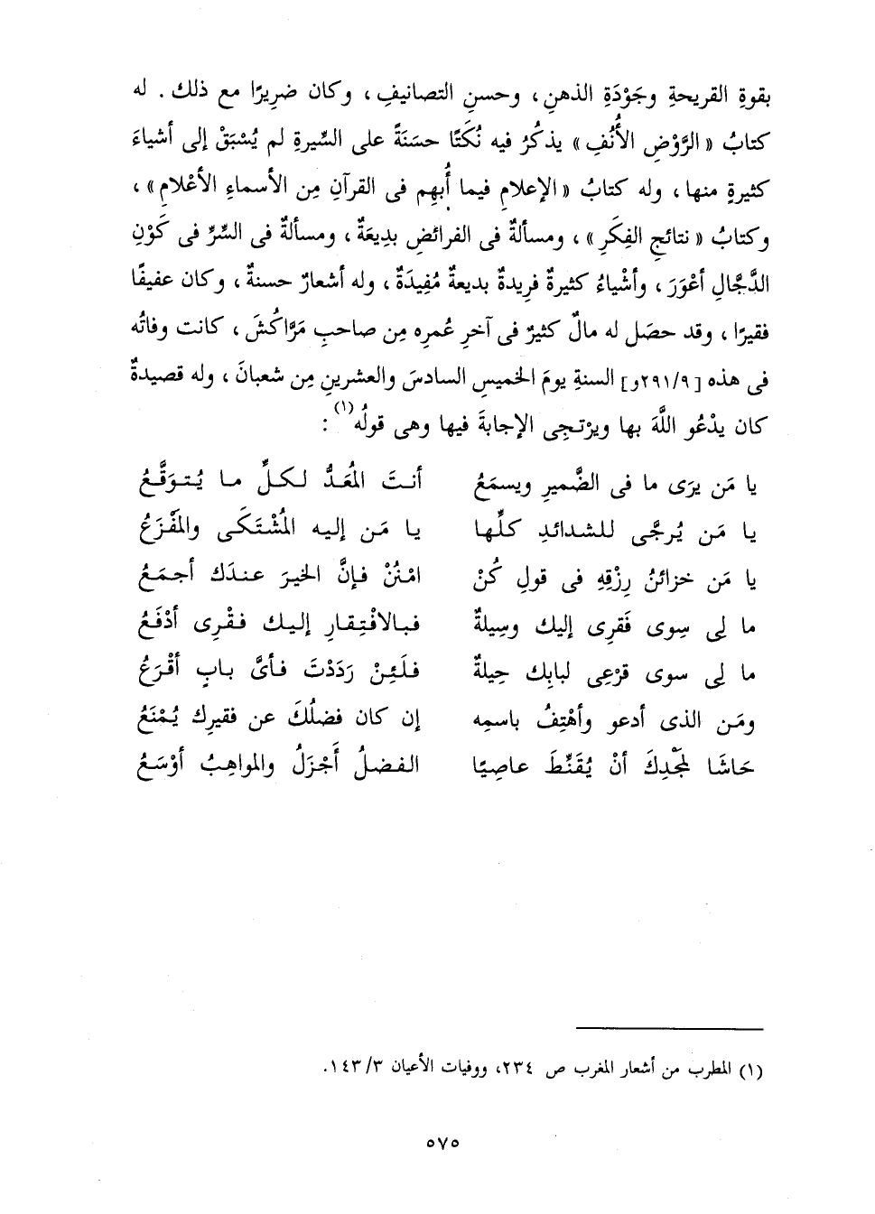 بِقُوَّةِ الْقَرِيحَةِ وَجَوْدَةِ الذِّهْنِ، وَحُسْنِ التَّصَانِيفِ، وَكَانَ ضَرِيرًا مَعَ ذَلِكَ. لَهُ كِتَابُ " الرَّوْضِ الْأُنُفِ " يَذْكُرُ فِيهِ نُكَتًا حَسَنَةً عَلَى السِّيرَةِ لَمْ يُسْبَقْ إِلَى أَشْيَاءَ كَثِيرَةٍ مِنْهَا، وَلَهُ كِتَابُ " الْإِعْلَامِ فِيمَا أُبْهِمَ فِي الْقُرْآنِ مِنَ الْأَسْمَاءِ الْأَعْلَامِ "، وَكِتَابُ " نَتَائِجِ الْفِكْرِ "، وَمَسْأَلَةٌ فِي الْفَرَائِضِ بَدِيعَةٌ، وَمَسْأَلَةٌ فِي السِّرِّ فِي كَوْنِ الدَّجَّالِ أَعْوَرَ، وَأَشْيَاءُ كَثِيرَةٌ فَرِيدَةٌ بَدِيعَةٌ مُفِيدَةٌ، وَلَهُ أَشْعَارٌ حَسَنَةٌ، وَكَانَ عَفِيفًا فَقِيرًا، وَقَدْ حَصَلَ لَهُ مَالٌ كَثِيرٌ فِي آخِرِ عُمْرِهِ مِنْ صَاحِبِ مُرَّاكِشَ كَانَتْ وَفَاتُهُ فِي هَذِهِ السَّنَةِ يَوْمَ الْخَمِيسِ السَّادِسَ وَالْعِشْرِينَ مِنْ شَعْبَانَ، وَلَهُ قَصِيدَةٌ كَانَ يَدْعُو اللَّهَ بِهَا وَيَرْتَجِي الْإِجَابَةَ فِيهَا وَهِيَ قَوْلُهُ: