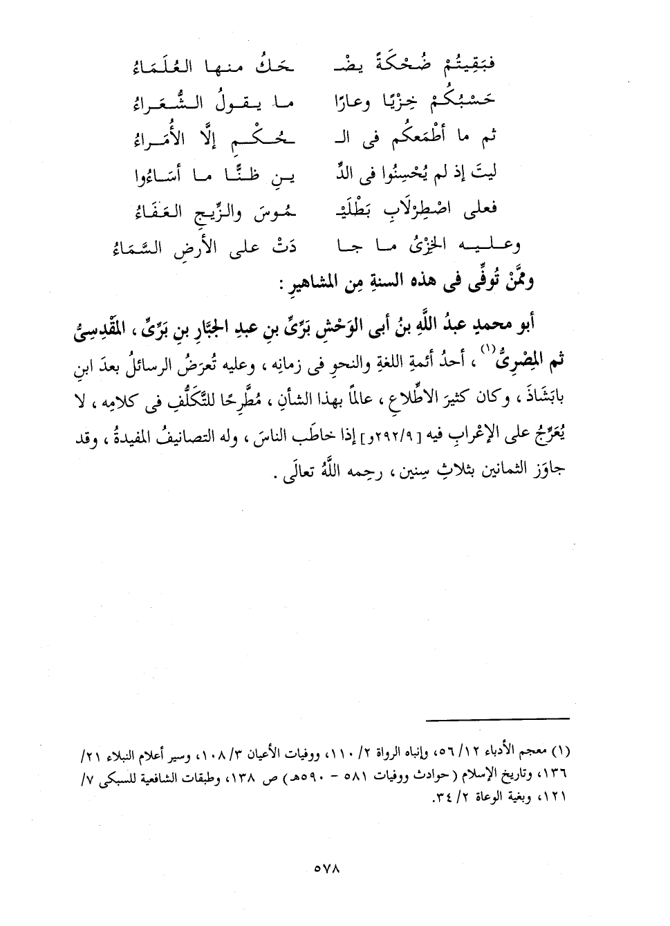بَرِّيُّ بْنُ عَبْدِ الْجَبَّارِ بْنِ بَرِّيٍّ، الْمَقْدِسِيُّ ثُمَّ الْمِصْرِيُّ، أَحَدُ أَئِمَّةِ اللُّغَةِ وَالنَّحْوِ فِي زَمَانِهِ، وَعَلَيْهِ تُعْرَضُ الرَّسَائِلُ بَعْدَ ابْنِ بَابَشَاذَ، وَكَانَ كَثِيرَ الِاطِّلَاعِ، عَالِمًا بِهَذَا الشَّأْنِ، مُطَّرِحًا لِلتَّكَلُّفِ فِي كَلَامِهِ، لَا يَلْتَفِتُ وَلَا يُعَرِّجُ عَلَى الْإِعْرَابِ فِيهِ إِذَا خَاطَبَ النَّاسَ، وَلَهُ التَّصَانِيفُ الْمُفِيدَةُ، وَقَدْ جَاوَزَ الثَّمَانِينَ بِثَلَاثِ سِنِينَ، رَحِمَهُ اللَّهُ تَعَالَى.