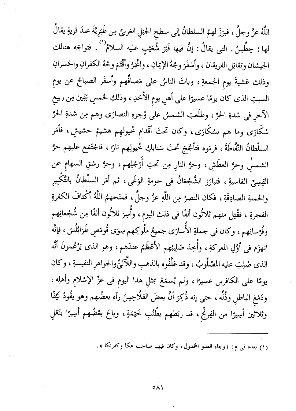 اللَّهُ عَزَّ وَجَلَّ، فَبَرَزَ لَهُمُ السُّلْطَانُ إِلَى سَطْحِ الْجَبَلِ الْغَرْبِيِّ مِنْ طَبَرِيَّةَ عِنْدَ قَرْيَةٍ يُقَالُ لَهَا: حِطِّينُ. الَّتِي يُقَالُ: إِنَّ فِيهَا قَبْرَ شُعَيْبٍ عَلَيْهِ السَّلَامُ. فَتَوَاجَهَ هُنَالِكَ الْجَيْشَانِ وَتَقَابَلَ الْفَرِيقَانِ، وَأَسْفَرَ وَجْهُ الْإِيمَانِ، وَاغْبَرَّ وَأَقْتَمَ وَجْهُ الْكُفْرَانِ وَالْخُسْرَانِ وَذَلِكَ عَشِيَّةَ يَوْمِ الْجُمُعَةِ، وَبَاتَ النَّاسُ عَلَى مَصَافِّهِمْ وَأَسْفَرَ الصَّبَاحُ عَنْ يَوْمِ السَّبْتِ الَّذِي كَانَ يَوْمًا عَسِيرًا عَلَى أَهْلِ يَوْمِ الْأَحَدِ، وَذَلِكَ لِخَمْسٍ بَقِينَ مِنْ رَبِيعٍ الْآخَرِ فِي شِدَّةِ الْحَرِّ، وَطَلَعَتِ الشَّمْسُ عَلَى وُجُوهِ النَّصَارَى وَهُمْ مِنْ شِدَّةِ الْحَرِّ سُكَارَى وَمَا هُمْ بِسُكَارَى، وَكَانَ تَحْتَ أَقَدْامِ خُيُولِهِمْ هَشِيمُ حَشِيشٍ، فَأَمَرَ السُّلْطَانُ النَّفَّاطَةَ، فَرَمَوْهُ فَتَأَجَّجَ تَحْتَ سَنَابِكِ خُيُولِهِمْ نَارًا، فَاجْتَمَعَ عَلَيْهِمْ حَرُّ الشَّمْسِ وَحَرُّ الْعَطَشِ، وَحَرُّ النَّارِ مِنْ تَحْتِ أَرْجُلِهِمْ، وَحَرُّ رَشْقِ السِّهَامِ عَنِ الْقِسِيِّ الْقَاسِيَةِ، فَتَبَارَزَ الشُّجْعَانُ فِي حَوْمَةِ الْوَغَى، ثُمَّ أَمَرَ السُّلْطَانُ بِالتَّكْبِيرِ وَالْحَمْلَةِ الصَّادِقَةِ، فَكَانَ النَّصْرُ مِنَ اللَّهِ عَزَّ وَجَلَّ، فَمَنَحَهُمُ اللَّهُ أَكْتَافَ الْكَفَرَةِ الْفَجَرَةِ، فَقُتِلَ مِنْهُمْ ثَلَاثُونَ أَلْفًا فِي ذَلِكَ الْيَوْمِ، وَأُسِرَ ثَلَاثُونَ أَلْفًا مِنْ شُجْعَانِهِمْ وَفُرْسَانِهِمْ، وَكَانَ فِي جُمْلَةِ الْأُسَارَى جَمِيعُ مُلُوكِهِمْ سِوَى قُومَصَ طَرَابُلُسَ فَإِنَّهُ انْهَزَمَ فِي أَوَّلِ الْمَعْرَكَةِ، وَأَخَذَ صَلِيبَهُمُ الْأَعْظَمَ عِنْدَهُمْ، وَهُوَ الَّذِي يَزْعُمُونَ أَنَّهُ الَّذِي صُلِبَ عَلَيْهِ الْمَصْلُوبُ، وَقَدْ غَلَّفُوهُ بِالذَّهَبِ وَاللَّآلِئِ وَالْجَوَاهِرِ النَّفْسِيَّةِ، وَكَانَ يَوْمًا عَلَى الْكَافِرِينَ عَسِيرًا، وَلَمْ يُسْمَعْ بِمِثْلِ هَذَا الْيَوْمِ فِي عِزِّ الْإِسْلَامِ وَأَهْلِهِ، وَدَمْغِ الْبَاطِلِ وَذُلِّهِ، حَتَّى إِنَّهُ ذُكِرَ أَنَّ بَعْضَ الْفَلَّاحِينَ رَآهُ بَعْضُهُمْ وَهُوَ يَقُودُ نَيِّفًا وَثَلَاثِينَ أَسِيرًا مِنَ الْفِرِنْجِ، قَدْ رَبَطَهُمْ بِطُنُبِ خَيْمَةٍ، وَبَاعَ بَعْضَهُمْ أَسِيرًا بِنَعْلٍ