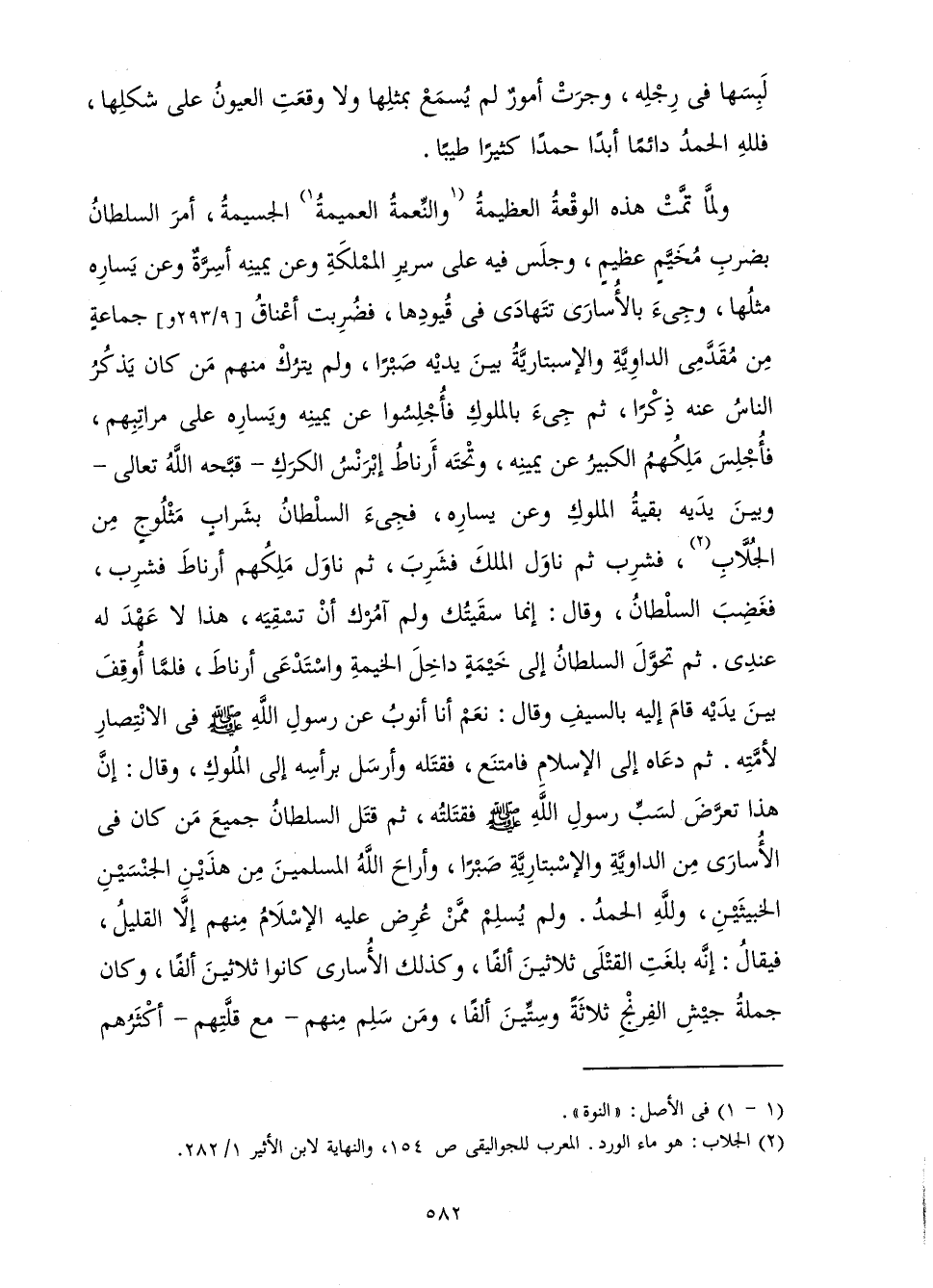 وَلَمَّا تَمَّتْ هَذِهِ الْوَقْعَةُ الْعَظِيمَةُ وَالنِّعْمَةُ الْعَمِيمَةُ الْجَسِيمَةُ، أَمَرَ السُّلْطَانُ بِضَرْبِ مُخَيَّمٍ عَظِيمٍ، وَجَلَسَ فِيهِ عَلَى سَرِيرِ الْمَمْلَكَةِ وَعَنْ يَمِينِهِ أَسِرَّةٌ وَعَنْ يَسَارِهِ مِثْلُهَا، وَجِيءَ بِالْأُسَارَى تَتَهَادَى فِي قُيُودِهَا، فَضُرِبَتْ أَعْنَاقُ جَمَاعَةٍ مِنْ مُقَدِّمِي الدَّاوِيَّةِ وَالْإِسْبِتَارِيَّةِ بَيْنَ يَدَيْهِ صَبْرًا، وَلَمْ يَتْرُكْ مِنْهُمْ مَنْ كَانَ يَذْكُرُ النَّاسُ عَنْهُ ذِكْرًا، ثُمَّ جِيءَ بِالْمُلُوكِ فَأُجْلِسُوا عَنْ يَمِينِهِ وَيَسَارِهِ عَلَى مَرَاتِبِهِمْ، فَأُجْلِسَ مَلِكُهُمُ الْكَبِيرُ عَنْ يَمِينِهِ، وَتَحْتَهُ أَرْنَاطُ إِبْرَنْسُ الْكَرَكِ - قَبَّحَهُ اللَّهُ تَعَالَى - وَبَيْنَ يَدَيْهِ بَقِيَّةُ الْمُلُوكِ وَعَنْ يَسَارِهِ، فَجِيءَ السُّلْطَانُ بِشَرَابٍ مَثْلُوجٍ مِنَ الْجُلَّابِ، فَشَرِبَ ثُمَّ نَاوَلَ الْمَلِكَ فَشَرِبَ، ثُمَّ نَاوَلَ مَلِكُهُمْ أَرْنَاطَ فَشَرِبَ، فَغَضِبَ السُّلْطَانُ، وَقَالَ: إِنَّمَا سَقَيْتُكَ وَلَمْ آمُرْكَ أَنْ تَسْقِيَهُ، هَذَا لَا عَهْدَ لَهُ عِنْدِي. ثُمَّ تَحَوَّلَ السُّلْطَانُ إِلَى خَيْمَةٍ دَاخِلَ الْخَيْمَةِ وَاسْتَدْعَى أَرْنَاطَ، فَلَمَّا أُوقِفَ بَيْنَ يَدَيْهِ قَامَ إِلَيْهِ بِالسَّيْفِ وَقَالَ: نَعَمْ أَنَا أَنُوبُ عَنْ رَسُولِ اللَّهِ صَلَّى اللَّهُ عَلَيْهِ وَسَلَّمَ فِي الِانْتِصَارِ لِأُمَّتِهِ. ثُمَّ دَعَاهُ إِلَى الْإِسْلَامِ فَامْتَنَعَ، فَقَتَلَهُ وَأَرْسَلَ بِرَأْسِهِ إِلَى الْمُلُوكِ، وَقَالَ: إِنَّ هَذَا تَعَرَّضَ لِسَبِّ رَسُولِ اللَّهِ صَلَّى اللَّهُ عَلَيْهِ وَسَلَّمَ فَقَتَلْتُهُ، ثُمَّ قَتَلَ السُّلْطَانُ جَمِيعَ مَنْ كَانَ مِنَ الْأُسَارَى مِنَ الدَّاوِيَّةِ وَالْإِسْبِتَارِيَّةِ صَبْرًا، وَأَرَاحَ اللَّهُ الْمُسْلِمِينَ مِنْ هَذَيْنَ الْجِنْسَيْنِ الْخَبِيثَيْنِ، وَلَمْ يُسْلِمْ مِمَّنْ عُرِضَ عَلَيْهِ الْإِسْلَامُ إِلَّا الْقَلِيلُ، فَيُقَالُ: إِنَّهُ بَلَغَتِ الْقَتْلَى ثَلَاثِينَ أَلْفًا، وَكَذَلِكَ الْأُسَارَى كَانُوا ثَلَاثِينَ أَلْفًا، وَكَانَ جُمْلَةُ جَيْشِ الْفِرِنْجِ ثَلَاثَةً وَسِتِّينَ أَلْفًا، وَمَنْ سَلِمَ مِنْهُمْ - مَعَ قِلَّتِهِمْ - أَكْثَرُهُمْ