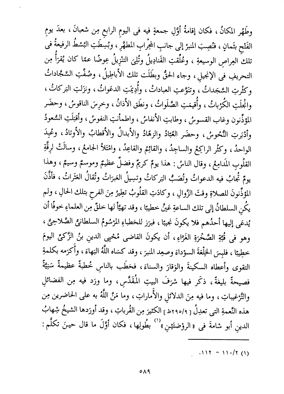 وَطَهُرَ الْمَكَانُ، فَكَانَ إِقَامَةُ أَوَّلِ جُمُعَةٍ فِيهِ فِي الْيَوْمِ الرَّابِعِ مِنْ شَعْبَانَ، بَعْدَ يَوْمِ الْفَتْحِ بِثَمَانٍ، فَنُصِبَ الْمِنْبَرُ إِلَى جَانِبِ الْمِحْرَابِ الْمُطَهَّرِ، وَبُسِطَتِ الْبُسُطُ الرَّفِيعَةُ فِي تِلْكَ الْعِرَاصِ الْوَسِيعَةِ، وَعُلِّقَتِ الْقَنَادِيلُ وَتُلِيَ التَّنْزِيلُ عِوَضًا عَمَّا كَانَ يُقْرَأُ مِنُ التَّحْرِيفِ فِي الْإِنْجِيلِ، وَجَاءَ الْحَقُّ وَبَطَلَتْ تِلْكَ الْأَبَاطِيلُ، وَصُفَّتِ السَّجَّادَاتُ وَكَثُرَتِ السَّجَدَاتُ، وَتَنَوَّعَتِ الْعِبَادَاتُ، وَأُدِيمَتِ الدَّعَوَاتُ، وَنَزَلَتِ الْبَرَكَاتُ، وَانْجَلَتِ الْكُرُبَاتُ، وَأُقِيمَتِ الصَّلَوَاتُ، وَنَطَقَ الْأَذَانُ، وَخَرِسَ النَّاقُوسُ، وَحَضَرَ الْمُؤَذِّنُونَ وَغَابَ الْقُسُوسُ، وَطَابَتِ الْأَنْفَاسُ، وَاطْمَأَنَّتِ النُّفُوسُ، وَأَقْبَلَتِ السُّعُودُ وَأَدْبَرَتِ النُّحُوسُ، وَحَضَرَ الْعِبَادُ وَالزُّهَّادُ وَالْأَبْدَالُ وَالْأَقْطَابُ وَالْأَوْتَادُ، وَعُبِدَ الْوَاحِدُ، وَكَثُرَ الرَّاكِعُ وَالسَّاجِدُ، وَالْقَائِمُ وَالْقَاعِدُ، وَامْتَلَأَ الْجَامِعُ، وَسَالَتْ لِرِقَّةِ الْقُلُوبِ الْمَدَامِعُ، وَقَالَ النَّاسُ: هَذَا يَوْمٌ كَرِيمٌ وَفَضْلٌ عَظِيمٌ وَمَوْسِمٌ وَسِيمٌ، وَهَذَا يَوْمٌ تُجَابُ فِيهِ الدَّعَوَاتُ وَتُصَبُّ الْبَرَكَاتُ وَتَسِيلُ الْعَبَرَاتُ وَتُقَالُ الْعَثَرَاتُ، فَأَذَّنَ الْمُؤَذِّنُونَ لِلصَّلَاةِ وَقْتَ الزَّوَالِ، وَكَادَتِ الْقُلُوبُ تَطِيرُ مِنَ الْفَرَحِ بِتِلْكَ الْحَالِ، وَلَمْ يَكُنِ السُّلْطَانُ إِلَى تِلْكَ السَّاعَةِ عَيَّنَ خَطِيبًا، وَقَدْ تَهَيَّأَ لَهَا خَلْقٌ مِنَ الْعُلَمَاءِ خَوْفًا أَنْ يَدَّعِيَ إِلَيْهَا أَحَدُهُمْ فَلَا يَكُونُ نَجِيبًا، فَبَرَزَ لِلْخُطَبَاءِ الْمَرْسُومُ السُّلْطَانِيُّ الصَّلَاحِيُّ، وَهُوَ فِي قُبَّةِ الصَّخْرَةِ الْغَرَّاءِ، أَنْ يَكُونَ الْقَاضِي مُحْيِي الدِّينِ بْنُ الزَّكِيِّ الْيَوْمَ خَطِيبًا، فَلَبِسَ الْخِلْعَةَ السَّوْدَاءَ وَصَعِدَ الْمِنْبَرَ، وَقَدْ كَسَاهُ اللَّهُ الْبَهَاءَ، وَأَكْرَمَهُ بِكَلِمَةِ التَّقْوَى وَأَعْطَاهُ السَّكِينَةَ وَالْوَقَارَ وَالسَّنَاءَ، فَخَطَبَ بِالنَّاسِ خُطْبَةً عَظِيمَةً سَنِيَّةً فَصِيحَةً بَلِيغَةً، ذَكَرَ فِيهَا شَرَفَ الْبَيْتِ الْمُقَدَّسِ، وَمَا وَرَدَ فِيهِ مِنَ الْفَضَائِلِ وَالتَّرْغِيبَاتِ، وَمَا فِيهِ مِنَ الدَّلَائِلِ وَالْأَمَارَاتِ، وَمَا مَنَّ اللَّهُ بِهِ عَلَى الْحَاضِرِينَ مِنْ هَذِهِ النِّعْمَةِ الَّتِي تَعْدِلُ الْكَثِيرَ مِنَ الْقُرُبَاتِ، وَقَدْ أَوْرَدَهَا الشَّيْخُ شِهَابُ الدِّينِ أَبُو شَامَةَ فِي " الرَّوْضَتَيْنِ " بِطُولِهَا، فَكَانَ أَوَّلَ مَا قَالَ حِينَ تَكَلَّمَ: