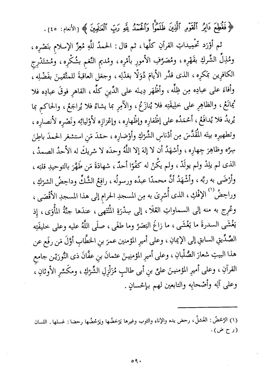 {فَقُطِعَ دَابِرُ الْقَوْمِ الَّذِينَ ظَلَمُوا وَالْحَمْدُ لِلَّهِ رَبِّ الْعَالَمِينَ} [الأنعام: 45] ثُمَّ أَوْرَدَ تَحْمِيدَاتِ الْقُرْآنِ كُلَّهَا، ثُمَّ قَالَ: الْحَمْدُ لِلَّهِ مُعِزِّ الْإِسْلَامِ بِنَصْرِهِ، وَمُذِلِّ الشِّرْكِ بِقَهْرِهِ، وَمُصَرِّفِ الْأُمُورِ بِأَمْرِهِ، وَمُدِيمِ النِّعَمِ بِشُكْرِهِ، وَمُسْتَدْرِجِ الْكَافِرِينَ بِمَكْرِهِ، الَّذِي قَدَّرَ الْأَيَّامَ دُوَلًا بِعَدْلِهِ، وَجَعَلَ الْعَاقِبَةَ لِلْمُتَّقِينَ بِفَضْلِهِ، وَأَفَاءَ عَلَى عِبَادِهِ مِنْ ظِلِّهِ، وَأَظْهَرَ دِينَهُ عَلَى الدِّينِ كُلِّهِ، الْقَاهِرِ فَوْقَ عِبَادِهِ فَلَا يُمَانَعُ، وَالظَّاهِرِ عَلَى خَلِيقَتِهِ فَلَا يُنَازَعُ، وَالْآمِرِ بِمَا يَشَاءُ فَلَا يُرَاجَعُ، وَالْحَاكِمِ بِمَا يُرِيدُ فَلَا يُدَافَعُ، أَحْمَدُهُ عَلَى إِظْفَارِهِ وَإِظْهَارِهِ، وَإِعْزَازِهِ لِأَوْلِيَائِهِ وَنَصْرِهِ لِأَنْصَارِهِ، وَتَطْهِيرِهِ بَيْتَهُ الْمُقَدَّسَ مِنْ أَدْنَاسِ الشِّرْكِ وَأَوْضَارِهِ، حَمْدَ مَنِ اسْتَشْعَرَ الْحَمْدَ بَاطِنَ سِرِّهِ وَظَاهِرَ جِهَارِهِ، وَأَشْهَدُ أَنْ لَا إِلَهَ إِلَّا اللَّهُ وَحْدَهُ لَا شَرِيكَ لَهُ الْأَحَدُ الصَّمَدُ، الَّذِي لَمْ يَلِدْ وَلَمْ يُولَدْ، وَلَمْ يَكُنْ لَهُ كُفُوًا أَحَدٌ شَهَادَةَ مَنْ طَهَّرَ بِالتَّوْحِيدِ قَلْبَهُ، وَأَرْضَى بِهِ رَبَّهُ، وَأَشْهَدُ أَنَّ مُحَمَّدًا عَبْدُهُ وَرَسُولُهُ، رَافِعُ الشَّكِّ وَدَاحِضُ الشِّرْكِ، وَرَاحِضُ الْإِفْكِ، الَّذِي أُسْرِيَ بِهِ مِنَ الْمَسْجِدِ الْحَرَامِ إِلَى هَذَا الْمَسْجِدِ الْأَقْصَى، وَعُرِجَ بِهِ مِنْهُ إِلَى السَّمَاوَاتِ الْعُلَا، إِلَى سِدْرَةِ الْمُنْتَهَى، {عِنْدَهَا جَنَّةُ الْمَأْوَى، إِذْ يَغْشَى السِّدْرَةَ مَا يَغْشَى، مَا زَاغَ الْبَصَرُ وَمَا طَغَى} [النجم: 15] ، صَلَّى اللَّهُ عَلَيْهِ وَعَلَى خَلِيفَتِهِ الصِّدِّيقِ السَّابِقِ إِلَى الْإِيمَانِ، وَعَلَى أَمِيرِ الْمُؤْمِنِينَ عُمَرَ بْنِ الْخَطَّابِ أَوَّلِ مَنْ رَفَعَ عَنْ هَذَا الْبَيْتِ شِعَارَ الصُّلْبَانِ، وَعَلَى أَمِيرِ الْمُؤْمِنِينَ عُثْمَانَ بْنِ عَفَّانَ ذِي النُّورَيْنِ جَامِعِ الْقُرْآنِ، وَعَلَى أَمِيرِ الْمُؤْمِنِينَ عَلِيِّ بْنِ أَبِي طَالِبٍ مُزَلْزِلِ الشِّرْكِ، وَمُكَسِّرِ الْأَوْثَانِ، وَعَلَى آلِهِ وَأَصْحَابِهِ وَالتَّابِعَيْنَ لَهُمْ بِإِحْسَانٍ.