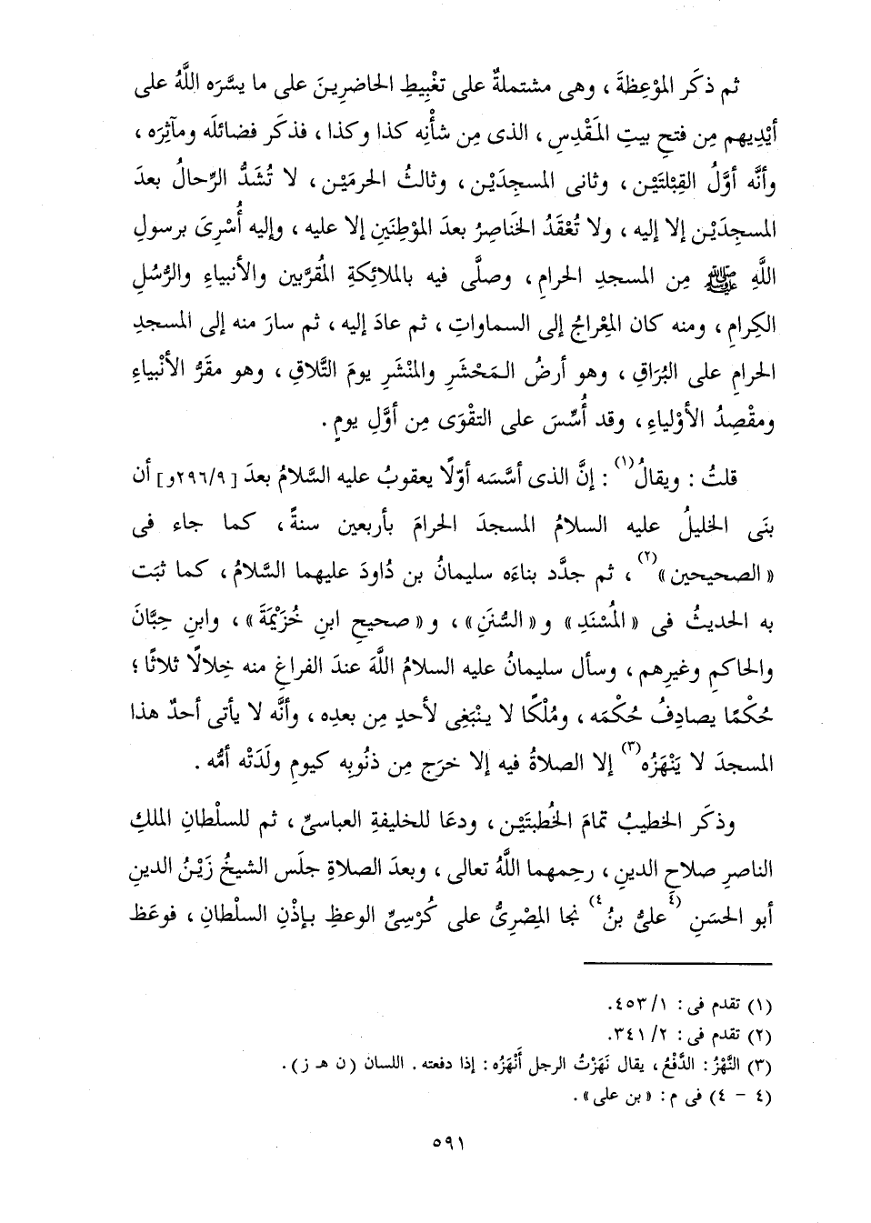 ثُمَّ ذَكَرَ الْمَوْعِظَةَ، وَهِيَ مُشْتَمِلَةٌ عَلَى تَغْبِيطِ الْحَاضِرِينَ عَلَى مَا يَسَّرَهُ اللَّهُ عَلَى أَيْدِيهِمْ مِنْ فَتْحِ بَيْتِ الْمَقْدِسِ الَّذِي مِنْ شَأْنِهِ كَذَا وَكَذَا، فَذَكَرَ فَضَائِلَهُ وَمَآثِرَهُ، وَأَنَّهُ أَوَّلُ الْقِبْلَتَيْنِ، وَثَانِي الْمَسْجِدَيْنِ، وَثَالِثُ الْحَرَمَيْنِ، لَا تُشَدُّ الرَّحَالُ بَعْدَ الْمَسْجِدَيْنِ إِلَّا إِلَيْهِ، وَلَا تُعْقَدُ الْخَنَاصِرُ بَعْدَ الْمَوْطِنَيْنِ إِلَّا عَلَيْهِ، وَإِلَيْهِ أُسَرِيَ بِرَسُولِ اللَّهِ صَلَّى اللَّهُ عَلَيْهِ وَسَلَّمَ مِنَ الْمَسْجِدِ الْحَرَامِ، وَصَلَّى فِيهِ بِالْمَلَائِكَةِ الْمُقَرَّبِينَ وَالْأَنْبِيَاءِ وَالرُّسُلِ الْكِرَامِ، وَمِنْهُ كَانَ الْمِعْرَاجُ إِلَى السَّمَاوَاتِ، ثُمَّ عَادَ إِلَيْهِ، ثُمَّ سَارَ مِنْهُ إِلَى الْمَسْجِدِ الْحَرَامِ عَلَى الْبُرَاقِ، وَهُوَ أَرْضُ الْمَحْشَرِ وَالْمَنْشَرِ يَوْمَ التَّلَاقِ، وَهُوَ مَقَرُّ الْأَنْبِيَاءِ وَمَقْصِدُ الْأَوْلِيَاءِ، وَقَدْ أُسِّسَ عَلَى التَّقْوَى مِنْ أَوَّلِ يَوْمٍ.