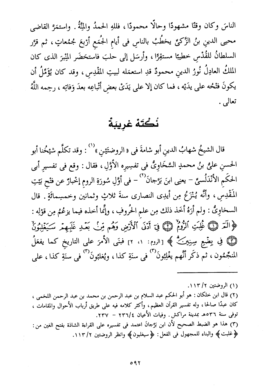 قَالَ الشَّيْخُ شِهَابُ الدِّينِ أَبُو شَامَةَ فِي " الرَّوْضَتَيْنِ ": وَقَدْ تَكَلَّمَ شَيْخُنَا أَبُو الْحَسَنِ عَلِيُّ بْنُ مُحَمَّدٍ السَّخَاوِيُّ فِي تَفْسِيرِهِ الْأَوَّلِ، فَقَالَ: وَقَعَ فِي تَفْسِيرِ أَبِي الْحَكَمِ الْأَنْدَلُسِيِّ - يَعْنِي ابْنَ بَرَّجَانَ - فِي أَوَّلِ سُورَةِ الرُّومِ إِخْبَارٌ عَنْ فَتْحِ بَيْتِ الْمَقْدِسِ وَأَنَّهُ يُنْزَعُ مِنْ أَيْدِي النَّصَارَى سَنَةَ ثَلَاثٍ وَثَمَانِينَ وَخَمْسِمِائَةٍ. قَالَ السَّخَاوِيُّ: وَلَمْ أَرَهُ أَخَذَ ذَلِكَ مِنْ عِلْمِ الْحُرُوفِ، وَإِنَّمَا أَخَذَهُ فِيمَا يَزْعُمُ مِنْ قَوْلِهِ {الم غُلِبَتِ الرُّومُ فِي أَدْنَى الْأَرْضِ وَهُمْ مِنْ بَعْدِ غَلَبِهِمْ سَيَغْلِبُونَ فِي بِضْعِ سِنِينَ} [الروم: 1]