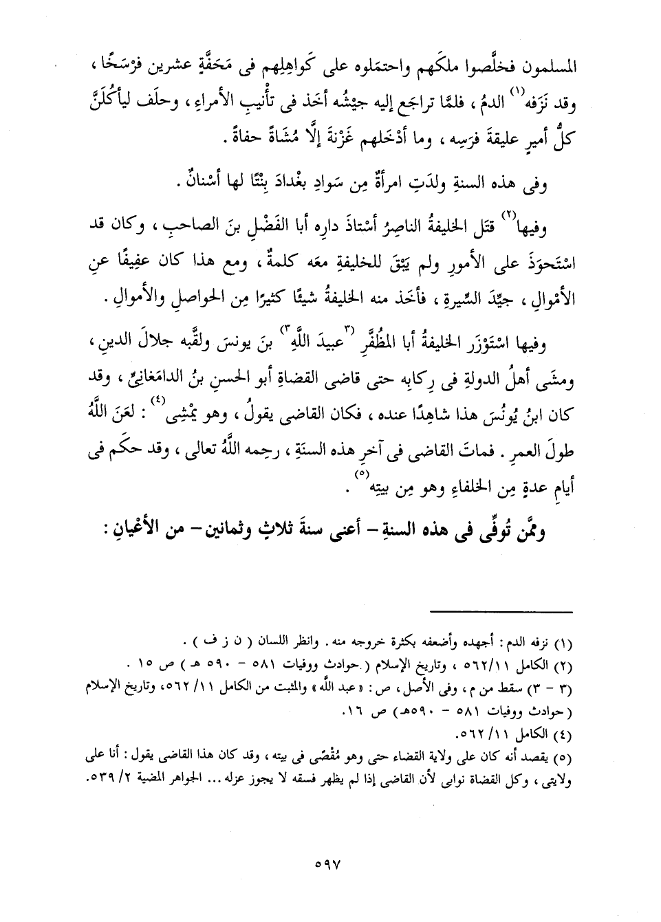 وَفِيهَا اسْتَوْزَرَ الْخَلِيفَةُ أَبَا الْمُظَفَّرِ عُبَيْدَ اللَّهِ بْنَ يُونُسَ وَلَقَّبَهُ جَلَالَ الدِّينِ، وَمَشَى أَهْلُ الدَّوْلَةِ فِي رِكَابِهِ حَتَّى قَاضِي الْقُضَاةِ أَبُو الْحَسَنِ بْنُ الدَّامَغَانِيِّ، وَقَدْ كَانَ ابْنُ يُونُسَ هَذَا شَاهِدًا عِنْدَهُ، فَكَانَ الْقَاضِي يَقُولُ وَهُوَ يَمْشِي: لَعَنَ اللَّهُ طُولَ الْعُمْرِ. فَمَاتَ الْقَاضِي فِي آخِرِ هَذِهِ السَّنَةِ، رَحِمَهُ اللَّهُ تَعَالَى، وَقَدْ حَكَمَ فِي أَيَّامِ عِدَّةٍ مِنَ الْخُلَفَاءِ وَهُوَ مِنْ بَيْتِهِ.