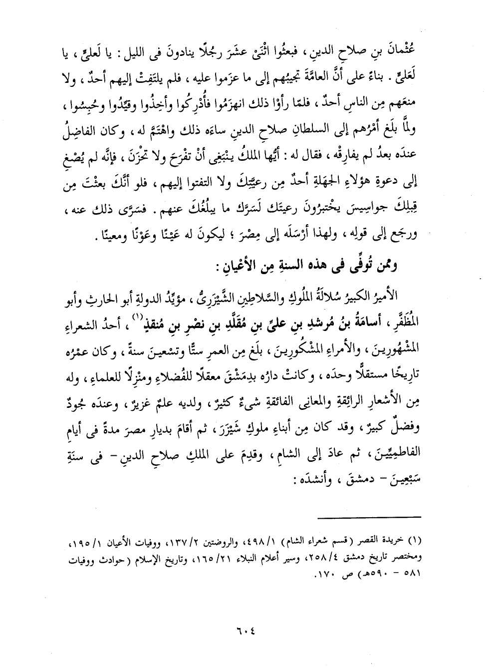 الشَّيْزَرِيُّ مُؤَيَّدُ الدَّوْلَةِ أَبُو الْحَارِثِ وَأَبُو الْمُظَفَّرِ أُسَامَةُ بْنُ مُرْشِدِ بْنِ عَلِيِّ بْنِ مُقَلَّدِ بْنِ نَصْرِ بْنِ مُنْقِذٍ، أَحَدُ الشُّعَرَاءِ الْمَشْهُورِينَ وَالْأُمَرَاءِ الْمَشْكُورِينَ بَلَغَ مِنَ الْعُمْرِ سِتًّا وَتِسْعِينَ سَنَةً وَكَانَ عُمْرُهُ تَارِيخًا مُسْتَقِلًّا وَحْدَهُ وَكَانَتْ دَارُهُ بِدِمَشْقَ مَعْقِلًا لِلْفُضَلَاءِ وَمَنْزِلًا لِلْعُلَمَاءِ، وَلَهُ مِنَ الْأَشْعَارِ الرَّائِقَةِ وَالْمَعَانِي الْفَائِقَةِ شَيْءٌ كَثِيرٌ، وَلَدَيْهِ عِلْمٌ غَزِيرٌ، وَعِنْدَهُ جُودٌ وَفَضْلٌ كَبِيرٌ، وَقَدْ كَانَ مِنْ أَبْنَاءِ مُلُوكِ شَيْزَرَ ثُمَّ أَقَامَ بِدِيَارِ مِصْرَ مُدَّةً فِي أَيَّامِ الْفَاطِمِيِّينَ، ثُمَّ عَادَ إِلَى الشَّامِ وَقَدِمَ عَلَى الْمَلِكِ صَلَاحِ الدِّينِ فِي سَنَةِ سَبْعِينَ وَأَنْشَدَهُ: