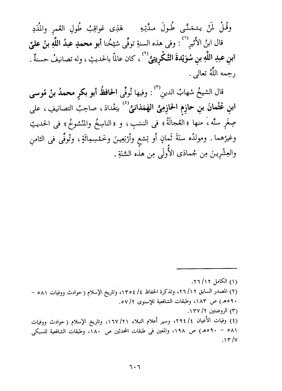 قَالَ الشَّيْخُ شِهَابُ الدِّينِ: وَفِيهَا تُوُفِّيَ الْحَافِظُ أَبُو بَكْرٍ مُحَمَّدُ بْنُ مُوسَى بْنِ عُثْمَانَ بْنِ حَازِمٍ الْحَازِمِيُّ الْهَمَذَانِيُّ بِبَغْدَادَ، صَاحِبُ التَّصَانِيفِ، عَلَى صِغَرِ سِنِّهِ مِنْهَا " الْعُجَالَةُ " فِي النَّسَبِ، وَ " النَّاسِخُ وَالْمَنْسُوخُ " فِي الْحَدِيثِ وَغَيْرُهُمَا. وَمَوْلِدُهُ سَنَةَ ثَمَانٍ أَوْ تِسْعٍ وَأَرْبَعِينَ وَخَمْسِمِائَةٍ، وَتُوُفِّيَ فِي الثَّامِنِ وَالْعِشْرِينَ مِنْ جُمَادَى الْأُولَى مِنْ هَذِهِ السَّنَةِ.