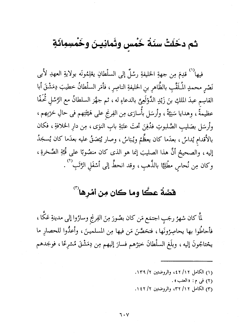 فِيهَا قَدِمَ مِنْ جِهَةِ الْخَلِيفَةِ رُسُلٌ إِلَى السُّلْطَانِ يُعْلِمُونَهُ بِوِلَايَةِ الْعَهْدِ لِأَبِي نَصْرٍ مُحَمَّدٍ الْمُلَقَّبِ بِالظَّاهِرِ بْنِ الْخَلِيفَةِ النَّاصِرِ، فَأَمَرَ السُّلْطَانُ خَطِيبَ دِمَشْقَ أَبَا الْقَاسِمِ عَبْدَ الْمَلِكِ بْنَ زَيْدٍ الدَّوْلَعِيَّ بِالدُّعَاءِ لَهُ، ثُمَّ جَهَّزَ السُّلْطَانُ مَعَ الرُّسُلِ تُحَفًا عَظِيمَةً، وَهَدَايَا سَنِيَّةً، وَأَرْسَلَ بِأُسَارَى مِنَ الْفِرِنْجِ عَلَى هَيْئَتِهِمْ فِي حَالِ حَرْبِهِمْ، وَأَرْسَلَ بِصَلِيبِ الصَّلَبُوتِ فَدُفِنَ تَحْتَ عَتَبَةِ بَابِ النَّوَى، مِنْ دَارِ الْخِلَافَةِ، فَكَانَ بِالْأَقَدْامِ يُدَاسُ، بَعْدَمَا كَانَ يُعَظَّمُ وَيُبَاسُ، وَصَارَ يُبْصَقُ عَلَيْهِ بَعْدَمَا كَانَ يُسْجَدُ إِلَيْهِ، وَالصَّحِيحُ أَنَّ هَذَا الصَّلِيبَ إِنَّمَا هُوَ الَّذِي كَانَ مَنْصُوبًا عَلَى قُبَّةِ الصَّخْرَةِ، وَكَانَ مِنْ نُحَاسٍ مَطْلِيًّا بِالذَّهَبِ، وَقَدِ انْحَطَّ إِلَى أَسْفَلِ الرُّتَبِ.