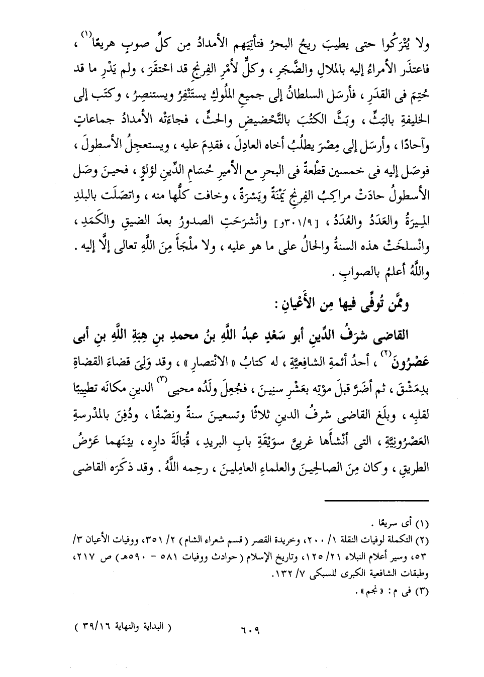 وَلَا يُتْرَكُوا حَتَّى يَطِيبَ رِيحُ الْبَحْرِ فَتَأْتِيَهِمُ الْأَمْدَادُ مِنْ كُلِّ صَوْبٍ هَرِيعًا، فَاعْتَذَرَ الْأُمَرَاءُ بِالْمَلَالِ وَالضَّجَرِ، وَكُلٌّ لِأَمْرِ الْفِرِنْجِ قَدِ احْتَقَرَ، وَلَمْ يَدْرِ مَا قَدْ حُتِّمَ فِي الْقَدَرِ، فَأَرْسَلَ السُّلْطَانُ إِلَى جَمِيعِ الْمُلُوكِ يَسْتَنْفِرُ وَيَسْتَنْصِرُ، وَكَتَبَ إِلَى الْخَلِيفَةِ بِالْبَثِّ، وَبَثَّ الْكُتُبَ بِالتَّحْضِيضِ وَالْحَثِّ، فَجَاءَتْهُ الْأَمْدَادُ جَمَاعَاتٍ وَآحَادًا، وَأَرْسَلَ إِلَى مِصْرَ يَطْلُبُ أَخَاهُ الْعَادِلَ، فَقَدِمَ عَلَيْهِ، وَيَسْتَعْجِلُ الْأُسْطُولَ، فَوَصَلَ إِلَيْهِ فِي خَمْسِينَ قِطْعَةً فِي الْبَحْرِ مَعَ الْأَمِيرِ حُسَامِ الدِّينِ لُؤْلُؤٍ، فَحِينَ وَصَلَ الْأُسْطُولُ حَادَتْ مَرَاكِبُ الْفِرِنْجِ يَمْنَةً وَيَسْرَةً، وَخَافَتْ كُلُّهَا مِنْهُ، وَاتَّصَلَتْ بِالْبَلَدِ الْمِيرَةُ وَالْعَدَدُ وَالْعُدَدُ وَانْشَرَحَتِ الصُّدُورُ بَعْدَ الضِّيقِ وَالْكَمَدِ، وَانْسَلَخَتْ هَذِهِ السَّنَةُ وَالْحَالُ عَلَى مَا هُوَ عَلَيْهِ، وَلَا مَلْجَأَ مِنَ اللَّهِ إِلَّا إِلَيْهِ. وَاللَّهُ أَعْلَمُ بِالصَّوَابِ.