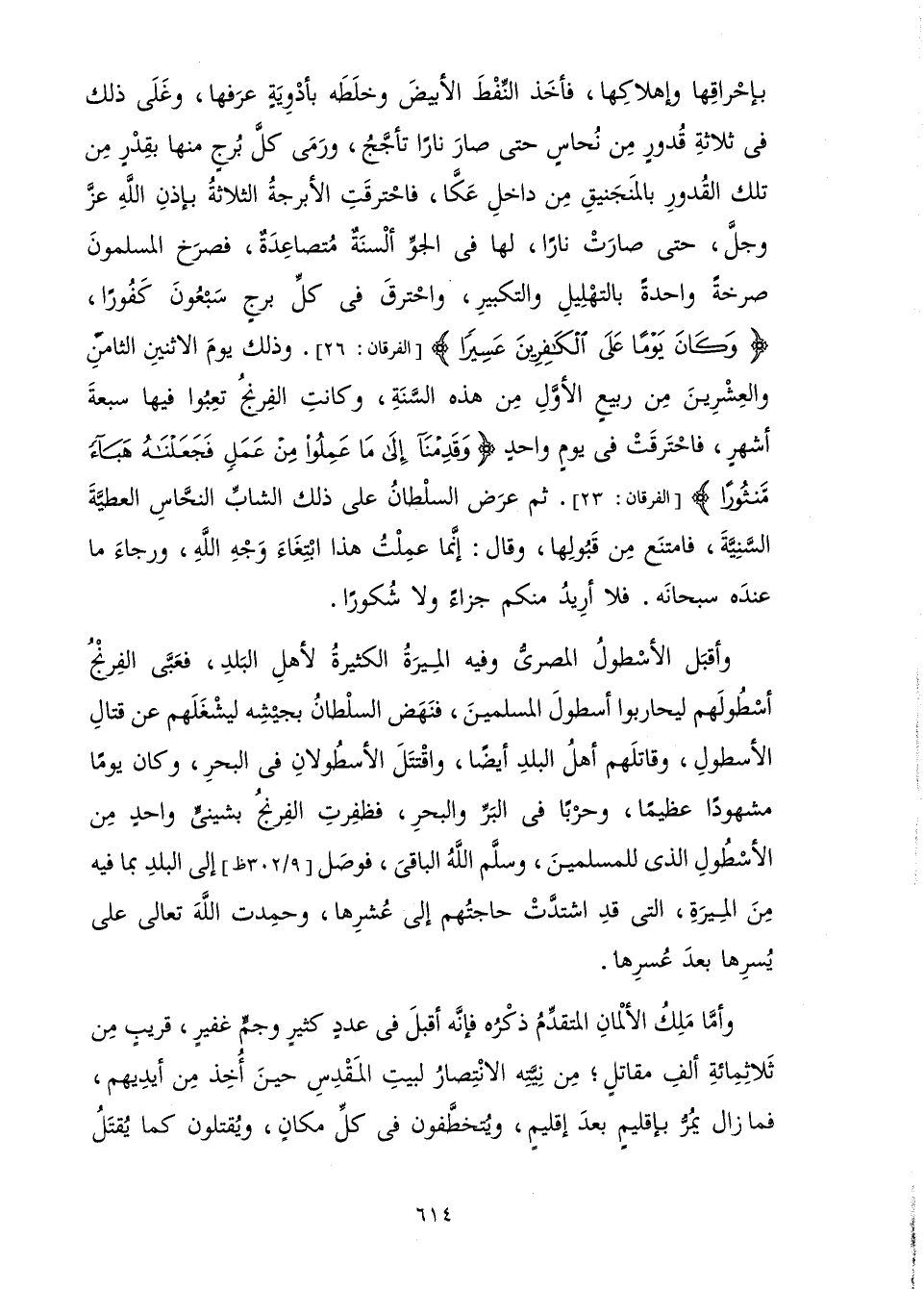 بِإِحْرَاقِهَا وَإِهْلَاكِهَا فَأَخَذَ النِّفْطَ الْأَبْيَضَ وَخَلَطَهُ بِأَدْوِيَةٍ عَرَفَهَا وَغَلَى ذَلِكَ فِي ثَلَاثَةِ قُدُورٍ مِنْ نُحَاسٍ حَتَّى صَارَ نَارًا تَأَجَّجُ وَرَمَى كُلَّ بُرْجٍ مِنْهَا بِقَدْرٍ مِنْ تِلْكَ الْقُدُورِ بِالْمَنْجَنِيقِ مِنْ دَاخِلِ عَكَّا فَاحْتَرَقَتِ الْأَبْرِجَةُ الثَّلَاثَةُ بِإِذْنِ اللَّهِ عَزَّ وَجَلَّ حَتَّى صَارَتْ نَارًا لَهَا فِي الْجَوِّ أَلْسِنَةٌ مُتَصَاعِدَةٌ فَصَرَخَ الْمُسْلِمُونَ صَرْخَةً وَاحِدَةً بِالتَّهْلِيلِ وَاحْتَرَقَ فِي كُلِّ بُرْجٍ مِنْهَا سَبْعُونَ كَفُورًا {وَكَانَ يَوْمًا عَلَى الْكَافِرِينَ عَسِيرًا} [الفرقان: 26] وَذَلِكَ يَوْمَ الِاثْنَيْنِ الثَّامِنِ وَالْعِشْرِينَ مِنْ رَبِيعٍ الْأَوَّلِ مِنْ هَذِهِ السَّنَةِ، وَكَانَتِ الْفِرِنْجُ تَعِبُوا فِيهَا سَبْعَةَ أَشْهُرٍ فَاحْتَرَقَتْ فِي يَوْمٍ وَاحِدٍ {وَقَدِمْنَا إِلَى مَا عَمِلُوا مِنْ عَمَلٍ فَجَعَلْنَاهُ هَبَاءً مَنْثُورًا} [الفرقان: 23] ثُمَّ عَرَضَ السُّلْطَانُ عَلَى ذَلِكَ الشَّابِّ النَّحَّاسِ الْعَطِيَّةَ السَّنِيَّةُ فَامْتَنَعَ مِنْ قَبُولِهَا وَقَالَ: إِنَّمَا عَمِلْتُ هَذَا ابْتِغَاءَ وَجْهِ اللَّهِ وَرَجَاءَ مَا عِنْدَهُ سُبْحَانَهُ فَلَا أُرِيدُ مِنْكُمْ جَزَاءً وَلَا شُكُورًا.