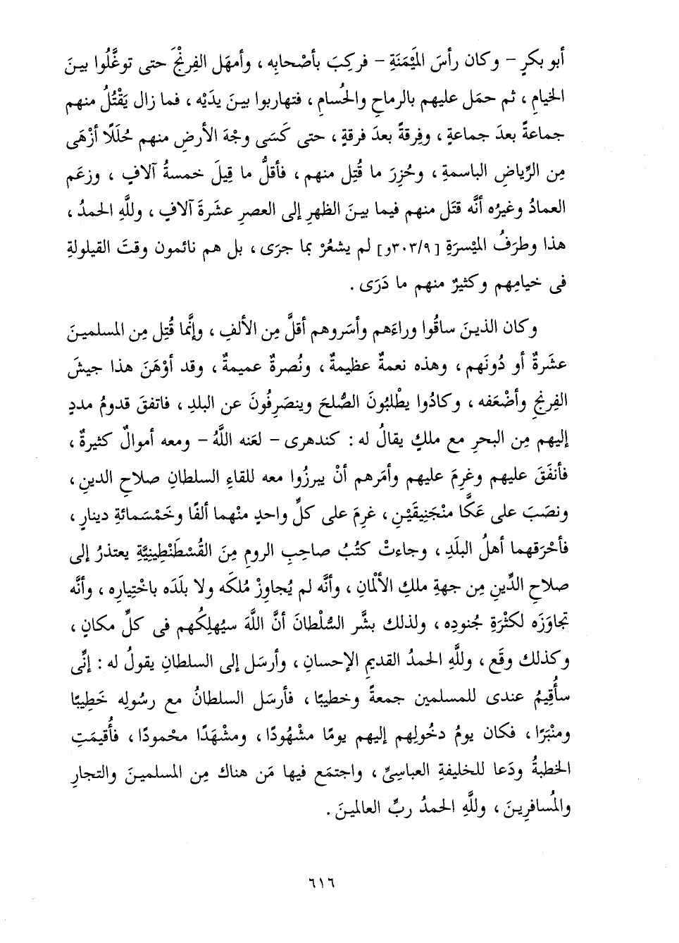 أَبُو بَكْرٍ - وَكَانَ رَأْسَ الْمَيْمَنَةِ - فَرَكِبَ فِي أَصْحَابِهِ وَأَمْهَلَ الْفِرِنْجَ حَتَّى تَوَغَّلُوا بَيْنَ الْخِيَامِ ثُمَّ حَمَلَ عَلَيْهِمْ بِالرِّمَاحِ وَالْحُسَامِ فَتَهَارَبُوا بَيْنَ يَدَيْهِ فَمَا زَالَ يَقْتُلُ مِنْهُمْ جَمَاعَةً بَعْدَ جَمَاعَةٍ وَفِرْقَةً بَعْدَ فِرْقَةٍ حَتَّى كَسَى وَجْهَ الْأَرْضِ مِنْهُمْ حُلَلًا أَزْهَى مِنَ الرِّيَاضِ الْبَاسِمَةِ وَحُزِرَ مَا قَتَلَ مِنْهُمْ فَأَقَلُّ مَا قِيلَ خَمْسَةُ آلَافٍ وَزَعَمَ الْعِمَادُ وَغَيْرُهُ أَنَّهُ قَتَلَ مِنْهُمْ فِيمَا بَيْنُ الظُّهْرِ إِلَى الْعَصْرِ عَشَرَةَ آلَافٍ وَلِلَّهِ الْحَمْدُ هَذَا وَطَرَفُ الْمَيْسَرَةِ لَمْ يَشْعُرْ بِمَا جَرَى بَلْ وَهُمْ نَائِمُونَ وَقْتَ الْقَيْلُولَةِ فِي خِيَامِهِمْ وَكَثِيرٌ مِنْهُمْ مَا دَرَى.