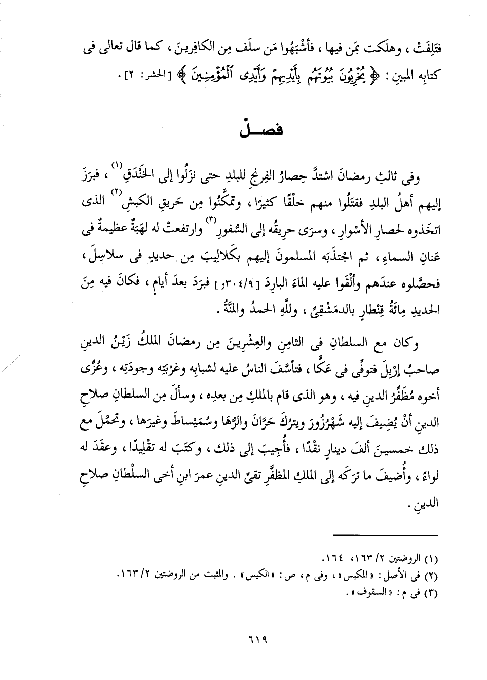 وَفِي ثَالِثِ رَمَضَانَ اشْتَدَّ حِصَارُ الْفِرِنْجِ لِلْبَلَدِ حَتَّى نَزَلُوا إِلَى الْخَنْدَقِ فَبَرَزَ إِلَيْهِمْ أَهْلُ الْبَلَدِ فَقَتَلُوا مِنْهُمْ خَلْقًا كَثِيرًا وَتَمَكَّنُوا مِنْ حَرِيقِ الْكَبْشِ الَّذِي اتَّخَذُوهُ لِحِصَارِ الْأَسْوَارِ وَسَرَى حَرِيقُهُ إِلَى السُّفُورِ، وَارْتَفَعَتْ لَهُ لَهَبَةٌ عَظِيمَةٌ فِي عَنَانِ السَّمَاءِ ثُمَّ اجْتَذَبَهُ الْمُسْلِمُونَ إِلَيْهِمْ بِكَلَالِيبَ مِنْ حَدِيدٍ فِي سَلَاسِلَ فَحَصَّلُوهُ عِنْدَهُمْ وَأَلْقَوْا عَلَيْهِ الْمَاءَ الْبَارِدَ فَبَرُدَ بَعْدَ أَيَّامٍ فَكَانَ فِيهِ مِنَ الْحَدِيدِ مِائَةُ قِنْطَارٍ بِالدِّمَشْقِيِّ وَلِلَّهِ الْحَمْدُ وَالْمِنَّةُ.