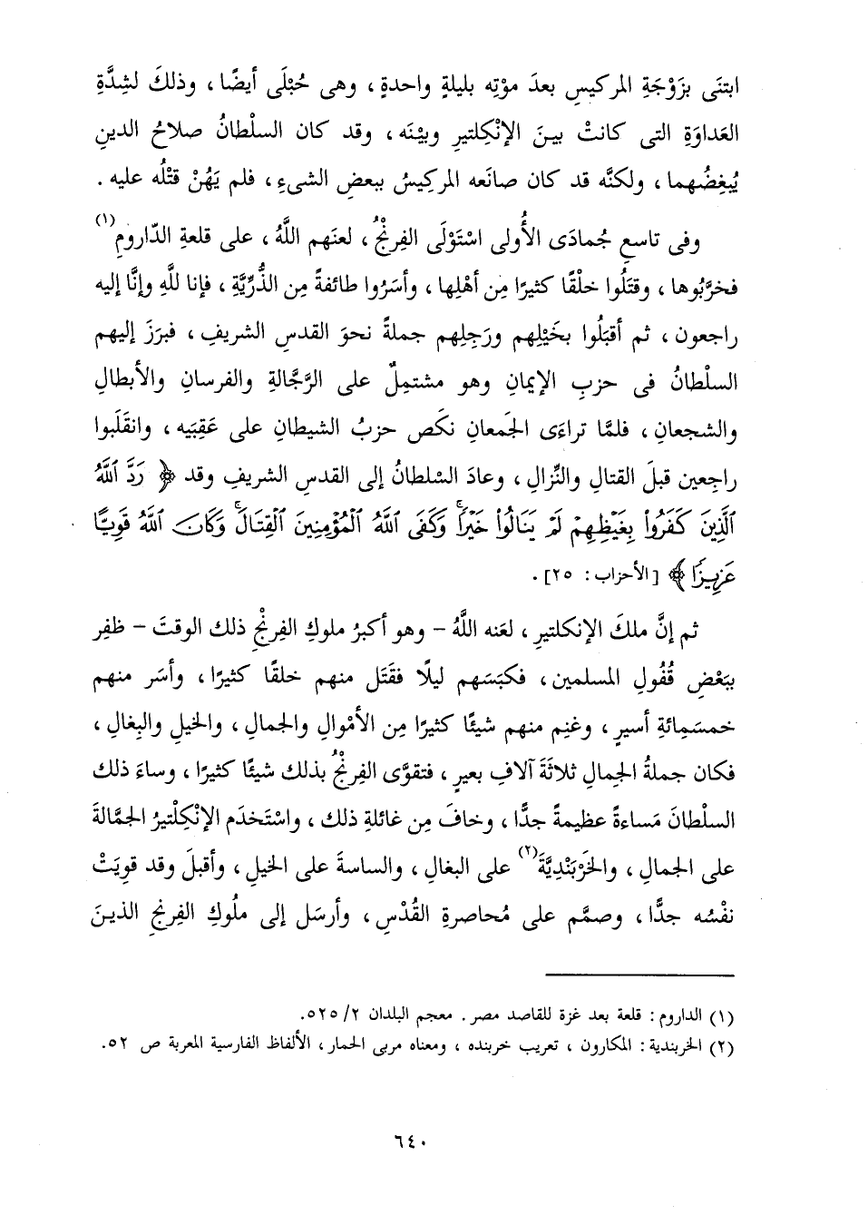 وَفِي تَاسِعِ جُمَادَى الْأُولَى اسْتَوْلَى الْفِرِنْجُ لَعَنَهُمُ اللَّهُ عَلَى قَلْعَةِ الدَّارُومِ فَخَرَّبُوهَا وَقَتَلُوا خَلْقًا كَثِيرًا مِنْ أَهْلِهَا وَأَسَرُوا طَائِفَةً مِنَ الذُّرِّيَّةِ فَإِنَّا لِلَّهِ وَإِنَّا إِلَيْهِ رَاجِعُونَ ثُمَّ أَقْبَلُوا بِخَيْلِهِمْ وَرَجِلِهِمْ جُمْلَةً نَحْوَ الْقُدْسِ الشَّرِيفِ فَبَرَزَ إِلَيْهِمُ السُّلْطَانُ فِي حِزْبِ الْإِيمَانِ وَهُوَ مُشْتَمِلٌ عَلَى الرَّجَّالَةِ وَالْفُرْسَانِ وَالْأَبْطَالِ وَالشُّجْعَانِ فَلَمَّا تَرَاءَى الْجَمْعَانِ نَكَصَ حِزْبُ الشَّيْطَانِ عَلَى عَقِبَيْهِ وَانْقَلَبُوا رَاجِعِينَ قَبْلَ الْقِتَالِ وَالنِّزَالِ وَعَادَ السُّلْطَانُ إِلَى الْقُدْسِ وَقَدْ {رَدَّ اللَّهُ الَّذِينَ كَفَرُوا بِغَيْظِهِمْ لَمْ يَنَالُوا خَيْرًا وَكَفَى اللَّهُ الْمُؤْمِنِينَ الْقِتَالَ وَكَانَ اللَّهُ قَوِيًّا عَزِيزًا} [الأحزاب: 25] ثُمَّ إِنَّ مَلِكَ الْإِنْكِلْتِيرِ - لَعَنَهُ اللَّهُ - وَهُوَ أَكْبَرُ مُلُوكِ الْفِرِنْجِ ذَلِكَ الْوَقْتَ ظَفِرَ بِبَعْضِ قُفُولِ الْمُسْلِمِينَ فَكَبَسَهُمْ لَيْلًا فَقَتَلَ مِنْهُمْ خَلْقًا كَثِيرًا وَأَسَرَ مِنْهُمْ خَمْسَمِائَةِ أَسِيرٍ وَغَنِمَ مِنْهُمْ شَيْئًا كَثِيرًا مِنَ الْأَمْوَالِ وَالْجِمَالِ وَالْخَيْلِ وَالْبِغَالِ فَكَانَ جُمْلَةُ الْجِمَالِ ثَلَاثَةَ آلَافِ بَعِيرٍ فَتَقَوَّى الْفِرِنْجُ بِذَلِكَ شَيْئًا كَثِيرًا وَسَاءَ ذَلِكَ السُّلْطَانَ مَسَاءَةً عَظِيمَةً جِدًّا وَخَافَ مِنْ غَائِلَةِ ذَلِكَ وَاسْتَخْدَمَ الْإِنْكِلْتِيرُ الْجَمَّالَةَ عَلَى الْجِمَالِ وَالْخَرْبَنْدِيَّةَ عَلَى الْبِغَالِ وَالسَّاسَةَ عَلَى الْخَيْلِ، وَأَقْبَلَ وَقَدْ قَوِيَتْ نَفْسُهُ جِدًّا، وَصَمَّمَ عَلَى مُحَاصَرَةِ الْقُدْسِ وَأَرْسَلَ إِلَى مُلُوكِ الْفِرِنْجِ الَّذِينَ