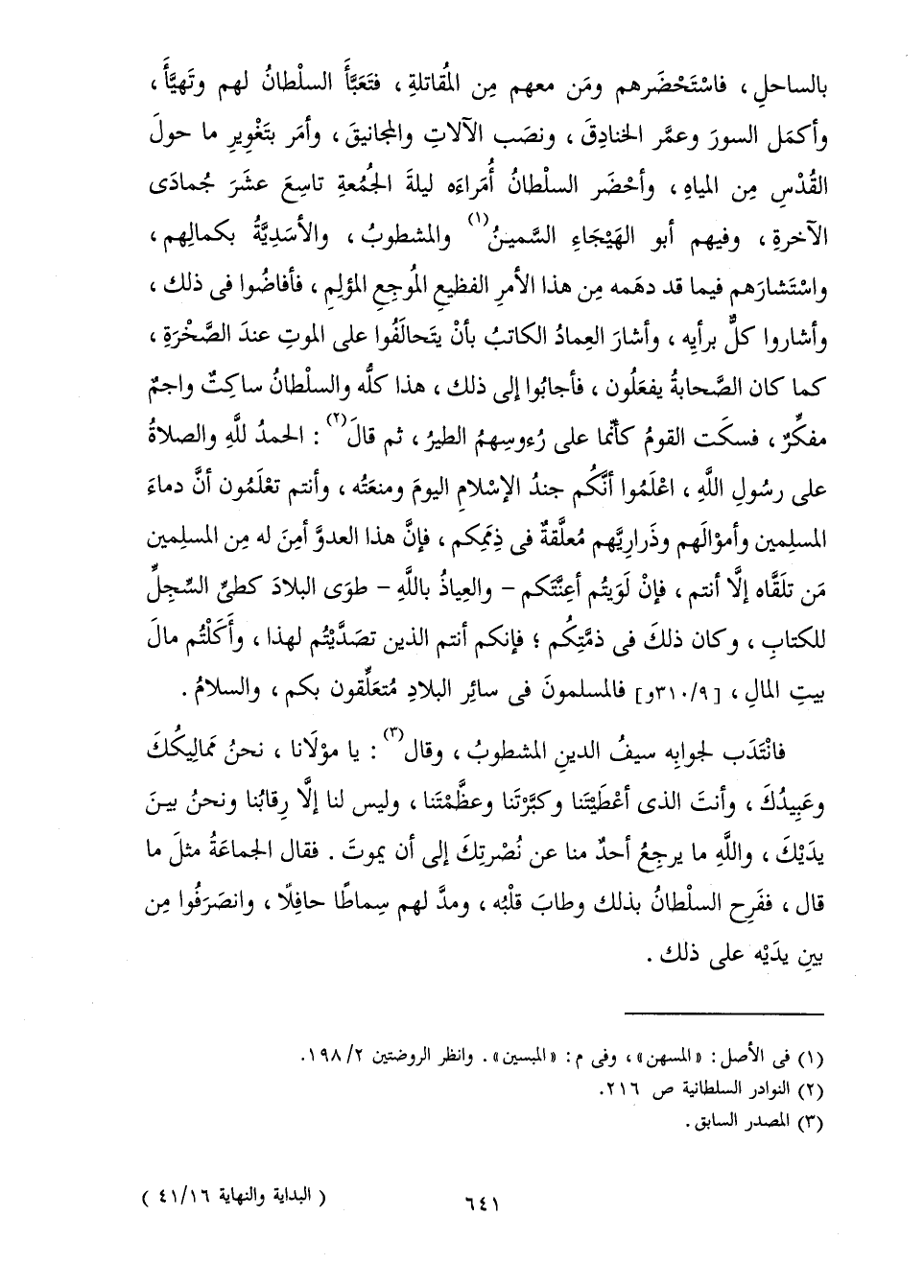 فَانْتَدَبَ لِجَوَابِهِ سَيْفُ الدِّينِ الْمَشْطُوبُ وَقَالَ: يَا مَوْلَانَا نَحْنُ مَمَالِيكُكَ وَعَبِيدُكَ وَأَنْتَ الَّذِي أَعْطَيْتَنَا وَكَبَّرْتَنَا وَعَظَّمْتَنَا، وَلَيْسَ لَنَا إِلَّا رِقَابُنَا وَنَحْنُ بَيْنُ يَدَيْكَ، وَاللَّهِ مَا يَرْجِعُ أَحَدٌ مِنَّا عَنْ نُصْرَتِكَ إِلَى أَنْ يَمُوتَ فَقَالَ الْجَمَاعَةُ مِثْلَ مَا قَالَ فَفَرِحَ السُّلْطَانُ بِذَلِكَ وَطَابَ قَلْبُهُ وَمَدَّ لَهُمْ سِمَاطًا حَافِلًا وَانْصَرَفُوا مِنْ بَيْنِ يَدَيْهِ عَلَى ذَلِكَ