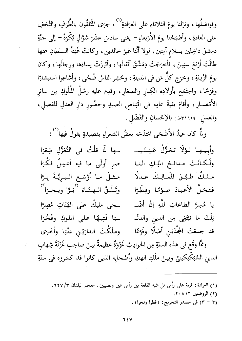 وَفَوَاضِلُهَا، وَنَزَلْنَا يَوْمَ الثُّلَاثَاءِ عَلَى الْعَرَّادَةِ جَرَى الْمُتَلَقُّونَ بِالطُّرَفِ وَالتُّحَفِ عَلَى الْعَادَةِ، وَأَصْبَحْنَا يَوْمَ الْأَرْبِعَاءِ - يَعْنِي سَادِسَ عَشَرَ شَوَّالٍ بُكْرَةً - إِلَى جَنَّةِ دِمَشْقَ دَاخِلِينَ بِسَلَامٍ آمِنِينَ لَوْلَا أَنَّنَا غَيْرُ خَالِدِينَ، وَكَانَتْ غَيْبَةُ السُّلْطَانِ عَنْهَا طَالَتْ أَرْبَعَ سِنِينَ فَأَخْرَجَتْ دِمَشْقُ أَثْقَالَهَا، وَأَبْرَزَتْ نِسَاءَهَا وَرِجَالَهَا، وَكَانَ يَوْمَ الزِّينَةِ وَخَرَجَ كُلٌّ مَنْ فِي الْمَدِينَةِ، وَحُشِرَ النَّاسُ ضُحًى وَأَشَاعُوا اسْتِبْشَارًا وَفَرَحًا، وَاجْتَمَعَ بِأَوْلَادِهِ الْكِبَارِ وَالصِّغَارِ، وِقَدِمَ عَلَيْهِ رُسُلُ الْمُلُوكِ مِنْ سَائِرِ الْأَمْصَارِ، وَأَقَامَ بَقِيَّةَ عَامِهِ فِي اقْتِنَاصِ الصَّيْدِ وَحُضُورِ دَارِ الْعَدْلِ لِلْفَصْلِ، وَالْعَمَلِ بِالْإِحْسَانِ وَالْفَضْلِ.