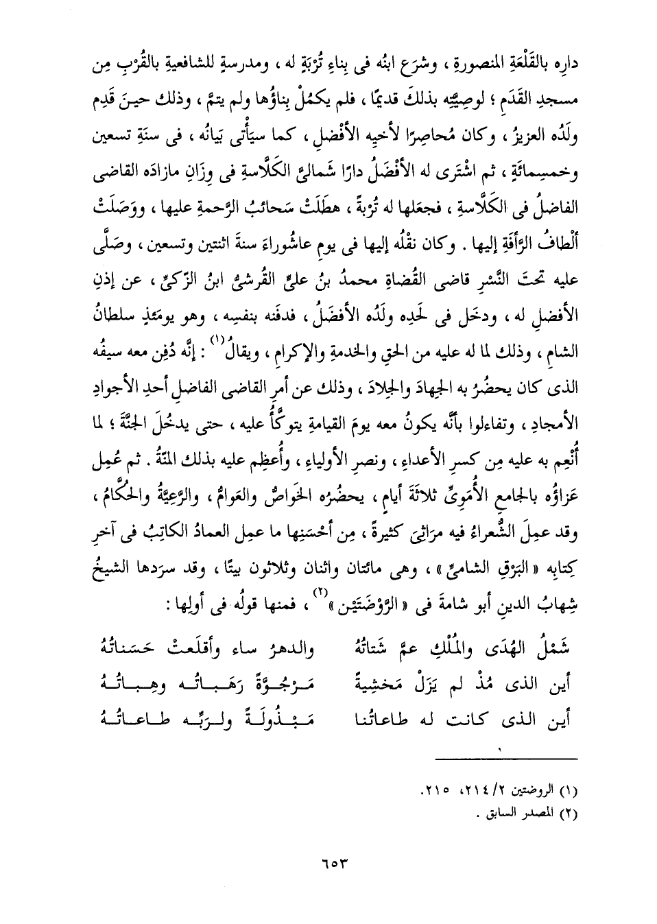فِي دَارِهِ بِالْقَلْعَةِ الْمَنْصُورَةِ، وَشَرَعَ ابْنُهُ فِي بِنَاءِ تُرْبَةٍ لَهُ وَمَدْرَسَةٍ لِلشَّافِعِيَّةِ بِالْقُرْبِ مِنْ مَسْجِدِ الْقَدَمِ لِوَصِيَّتِهِ بِذَلِكَ قَدِيمًا، فَلَمْ يَكْمُلْ بِنَاؤُهَا وَلَمْ يَتِمَّ، وَذَلِكَ حِينَ قَدِمَ وَلَدُهُ الْعَزِيزُ وَكَانَ مُحَاصِرًا لِأَخِيهِ الْأَفْضَلِ كَمَا سَيَأْتِي بَيَانُهُ فِي سَنَةِ تِسْعِينَ وَخَمْسِمِائَةٍ ثُمَّ اشْتَرَى لَهُ الْأَفْضَلُ دَارًا شَمَالِيَّ الْكَلَّاسَةِ فِي وِزَانِ مَا زَادَهُ الْقَاضِي الْفَاضِلُ فِي الْكَلَّاسَةِ فَجَعَلَهَا لَهُ تُرْبَةً هَطَلَتْ سَحَائِبُ الرَّحْمَةِ عَلَيْهَا، وَوَصَلَتْ أَلْطَافُ الرَّأْفَةِ إِلَيْهَا، وَكَانَ نَقْلُهُ إِلَيْهَا فِي يَوْمِ عَاشُورَاءَ سَنَةَ اثْنَتَيْنِ وَتِسْعِينَ، وَصَلَّى عَلَيْهِ تَحْتَ النَّسْرِ قَاضِي الْقُضَاةِ مُحَمَّدُ بْنُ عَلِيٍّ الْقُرَشِيُّ ابْنُ الزَّكِيِّ عَنْ إِذَنِ الْأَفْضَلِ لَهُ، وَدَخَلَ فِي لَحْدِهِ وَلَدُهُ الْأَفْضَلُ فَدَفَنَهُ بِنَفْسِهِ وَهُوَ يَوْمَئِذٍ سُلْطَانُ الشَّامِ، وَذَلِكَ لِمَا لَهُ عَلَيْهِ مِنَ الْحَقِّ وَالْخِدْمَةِ وَالْإِكْرَامِ وَيُقَالُ: إِنَّهُ دُفِنَ مَعَهُ سَيْفُهُ الَّذِي كَانَ يَحْضُرُ بِهِ الْجِهَادَ وَالْجِلَادَ، وَذَلِكَ عَنْ أَمْرِ الْقَاضِي الْفَاضِلِ أَحَدِ الْأَجْوَادِ وَالْأَمْجَادِ، وَتَفَاءَلُوا بِأَنَّهُ يَكُونُ مَعَهُ يَوْمَ الْقِيَامَةِ يَتَوَكَّأُ عَلَيْهِ حَتَّى يَدْخُلَ الْجَنَّةَ لِمَا أُنْعِمَ بِهِ عَلَيْهِ مِنْ كَسْرِ الْأَعْدَاءِ وَنَصْرِ الْأَوْلِيَاءِ، وَأُعْظِمَ عَلَيْهِ بِتِلْكَ الْمِنَّةِ ثُمَّ عُمِلَ عَزَاؤُهُ بِالْجَامِعِ الْأُمَوِيِّ ثَلَاثَةَ أَيَّامٍ، يَحْضُرُهُ الْخَوَاصُّ وَالْعَوَّامُّ وَالرَّعِيَّةُ وَالْحُكَّامُ وَقَدْ عَمِلَ الشُّعَرَاءُ فِيهِ مَرَاثِيَ كَثِيرَةً، مِنْ أَحْسَنِهَا مَا عَمِلَ الْعِمَادُ الْكَاتِبُ فِي آخِرِ كِتَابِهِ " الْبَرْقِ الشَّامِيِّ " وَهِيَ مِائَتَانِ وَاثْنَانِ وَثَلَاثُونَ بَيْتًا وَقَدْ سَرَدَهَا الشَّيْخُ شِهَابُ الدِّينِ أَبُو شَامَةَ فِي " الرَّوْضَتَيْنِ " فَمِنْهَا قَوْلُهُ: فِي أَوَّلِهَا: