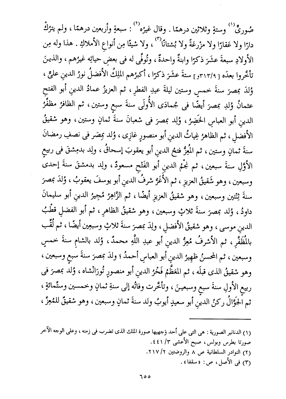 صُورِيٍّ وَسِتَّةٍ وَثَلَاثِينَ دِرْهَمًا. وَقَالَ غَيْرُهُ: سَبْعَةٍ وَأَرْبَعِينَ دِرْهَمًا، وَلَمْ يَتْرُكْ دَارًا وَلَا عَقَارًا وَلَا مَزْرَعَةً وَلَا بُسْتَانًا، وَلَا شَيْئًا مِنْ أَنْوَاعِ الْأَمْلَاكِ. هَذَا وَلَهُ مِنَ الْأَوْلَادِ سَبْعَةَ عَشَرَ ذَكَرًا وَابْنَةٌ وَاحِدَةٌ، وَتُوُفِّيَ لَهُ فِي بَعْضِ حَيَاتِهِ غَيْرُهُمْ، وَالَّذِينَ تَأَخَّرُوا بَعْدَهُ سِتَّةَ عَشَرَ ذَكَرًا، أَكْبَرُهُمُ الْمَلِكُ الْأَفْضَلُ نُورُ الدِّينِ عَلِيٌّ، وُلِدَ بِمِصْرَ سَنَةَ خَمْسٍ وَسِتِّينَ لَيْلَةَ عِيدِ الْفِطْرِ، ثُمَّ الْعَزِيزُ عِمَادُ الدِّينِ أَبُو الْفَتْحِ عُثْمَانُ وُلِدَ بِمِصْرَ أَيْضًا فِي جُمَادَى الْأُولَى سَنَةَ سَبْعٍ وَسِتِّينَ، ثُمَّ الظَّافِرُ مُظَفَّرُ الدِّينِ أَبُو الْعَبَّاسِ الْخَضِرُ، وُلِدَ بِمِصْرَ فِي شَعْبَانَ سَنَةَ ثَمَانٍ وَسِتِّينَ، وَهُوَ شَقِيقُ الْأَفْضَلِ، ثُمَّ الظَّاهِرُ غِيَاثُ الدِّينِ أَبُو مَنْصُورٍ غَازِيٌّ، وُلِدَ بِمِصْرَ فِي نِصْفِ رَمَضَانَ سَنَةَ ثَمَانٍ وَسِتِّينَ، ثُمَّ الْمُعِزُّ فَتْحُ الدِّينِ أَبُو يَعْقُوبَ إِسْحَاقُ، وُلِدَ بِدِمَشْقَ فِي رَبِيعٍ الْأَوَّلِ سَنَةَ سَبْعِينَ، ثُمَّ نَجْمُ الدِّينِ أَبُو الْفَتْحِ مَسْعُودٌ، وُلِدَ بِدِمَشْقَ سَنَةَ إِحْدَى وَسَبْعَيْنِ، وَهُوَ شَقِيقُ الْعَزِيزِ، ثُمَّ الْأَغَرُّ شَرَفُ الدِّينِ أَبُو يُوسُفَ يَعْقُوبُ، وُلِدَ بِمِصْرَ سَنَةَ ثِنْتَيْنِ وَسَبْعَيْنِ، وَهُوَ شَقِيقُ الْعَزِيزِ أَيْضًا، ثُمَّ الزَّاهِرُ مُجِيرُ الدِّينِ أَبُو سُلَيْمَانَ دَاوُدُ، وُلِدَ بِمِصْرَ سَنَةَ ثَلَاثٍ وَسَبْعِينَ، وَهُوَ شَقِيقُ الظَّاهِرِ، ثُمَّ أَبُو الْفَضْلِ قُطْبُ الدِّينِ مُوسَى، وَهُوَ شَقِيقُ الْأَفْضَلِ، وُلِدَ بِمِصْرَ سَنَةَ ثَلَاثٍ وَسَبْعِينَ أَيْضًا، ثُمَّ لُقِّبَ بِالْمُظَفَّرِ، ثُمَّ الْأَشْرَفُ مُعِزُّ الدِّينِ أَبُو عَبْدِ اللَّهِ مُحَمَّدُ، وُلِدَ بِالشَّامِ سَنَةَ خَمْسٍ وَسَبْعِينَ، ثُمَّ الْمُحْسِنُ ظَهِيرُ الدِّينِ أَبُو الْعَبَّاسِ أَحْمَدُ ; وُلِدَ بِمِصْرَ سَنَةَ سَبْعٍ وَسَبْعِينَ، وَهُوَ شَقِيقُ الَّذِي قَبْلَهُ، ثُمَّ الْمُعَظَّمُ فَخْرُ الدِّينِ أَبُو مَنْصُورٍ تُورَانْشَاهْ، وُلِدَ بِمِصْرَ فِي رَبِيعٍ الْأَوَّلِ سَنَةَ سَبْعٍ وَسَبْعِينَ، وَتَأَخَّرَتْ وَفَاتُهُ إِلَى سَنَةِ ثَمَانٍ وَخَمْسِينَ وَسِتِّمِائَةٍ، ثُمَّ الْجَوَّالُ رُكْنُ الدِّينِ أَبُو سَعِيدٍ أَيُّوبُ وُلِدَ سَنَةَ ثَمَانٍ وَسَبْعَيْنِ، وَهُوَ شَقِيقٌ لِلْمُعِزِّ،