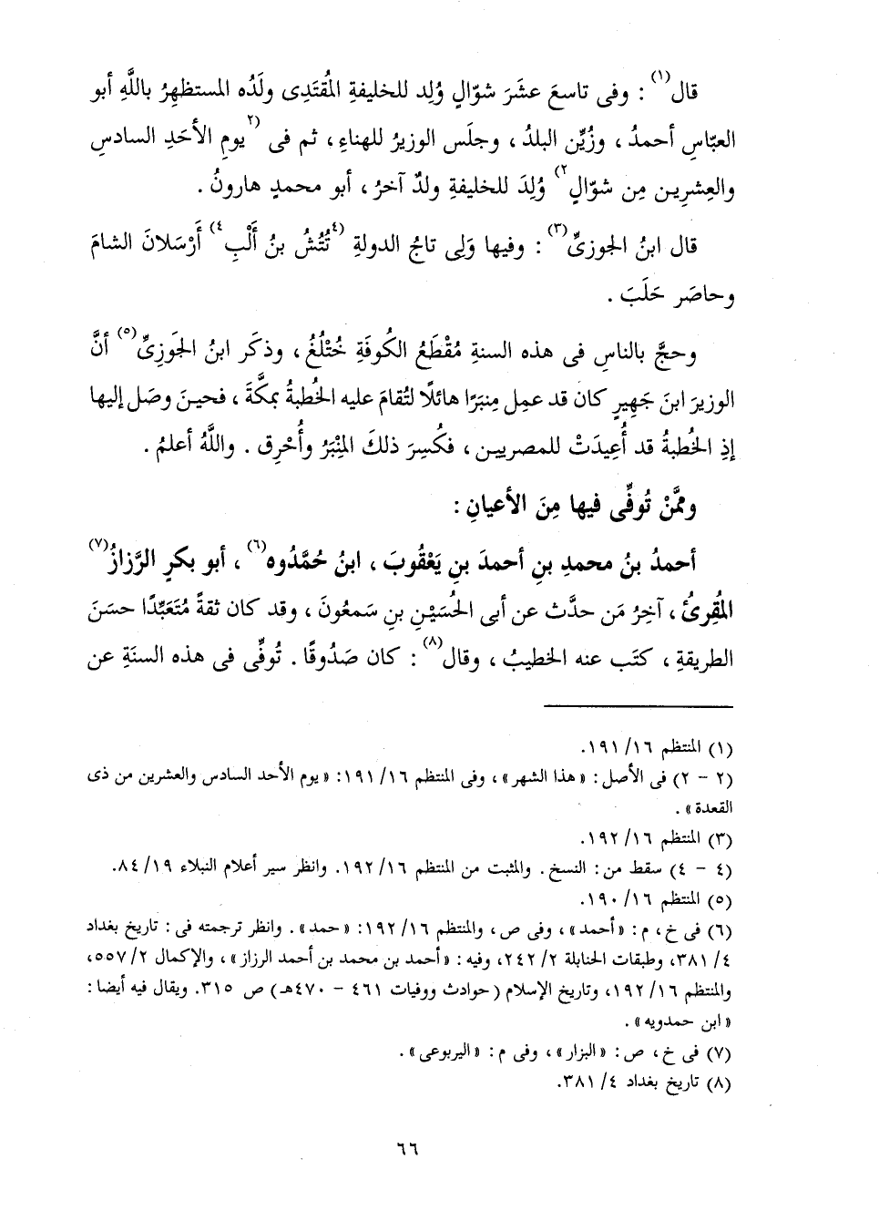 قَالَ: وَفِي تَاسِعَ عَشَرَ شَوَّالٍ وُلِدَ لِلْخَلِيفَةِ الْمُقْتَدِي وَلَدُهُ الْمُسْتَظْهِرُ بِاللَّهِ أَبُو الْعَبَّاسِ أَحْمَدُ، وَزُيِّنَ الْبَلَدُ وَجَلَسَ الْوَزِيرُ لِلْهَنَاءِ، ثُمَّ فِي يَوْمِ الْأَحَدِ السَّادِسِ وَالْعِشْرِينَ مِنْ شَوَّالٍ وُلِدَ لَهُ وَلَدٌ آخَرُ وَهُوَ أَبُو مُحَمَّدٍ هَارُونُ.
